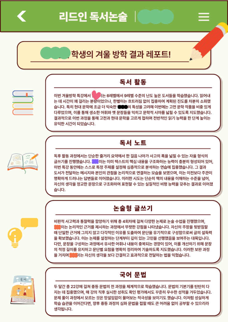 안녕하세요, 리드인 독서논술 학원 모당초점입니다. 길게만 느껴지던 겨울방학이 끝나고 이제 새 학기가 시작되었습니다. 저희 리드인 독서논술 모당초점 역시 겨울방학 특강을 끝마쳤습니다. 지난 두 달간 진행된 중·고등학생 대상 특강 수업이 성공적으로 마무리되었습니다. 이번 특강은 단순한 독서 수업이 아니라, 학교 내신 서술형 대비 + 논술형 글쓰기 강화 + 문법 기초 완성을 목표로 구성되었습니다. 1️⃣ 도서 목록 이번 특강의 가장 큰 특징은 ✔ 교과 연계 도서 ✔ 고전문학 ✔ 현대문학 세 가지 영역에 부합하는 도서 목록을 만든 후 각자 읽기 레벨과 관심사, 학교 진도에 맞춰 독서를 진행했다는 점입니다. 이를 통해 작품을 분....... <img src="https://blogthumb.pstatic.net/MjAyNjAzMDNfMjc3/MDAxNzcyNTE1NTQ0NTU2.XL35Ix2szIbGbRnu0qkhb44Y9Zfsjdka_h9t1nIHLe8g.RmImm_4g7XG5cH0Vzm2D-xMu7bd8pVpBfjGK-rva6g4g.PNG/1.png?type=s3" />