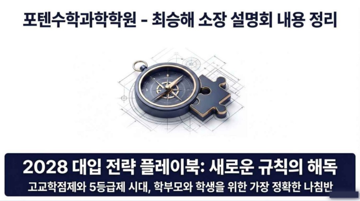 "팩트 체크로 시작하는 전문가의 카리스마“ 고교학점제에서 과목 선택...... "자유롭게 선택하라, 네가 하고 싶은 걸 들어라"는 학교의 달콤한 말, 그 뒤에 숨겨진 입시의 함정을 간과하고 계시지는 않나요? 안녕하세요. 포텐 수학과학 학원 원장입니다. 지난 설명회에서 학부모님들의 반응이 뜨거웠던 [2028 대입 전략] 핵심 내용을 정리했습니다. 요즘 상담을 하다 보면 "5등급제에서도 내신만 잘 챙기면 되는 것 아니냐"라는 질문을 많이 받습니다. 하지만 제가 15년 넘게 현장에서 지켜본 입시의 진실은 전혀 다릅니다. 등급의 칸막이가 넓어진 만큼, 대학은 이제 '몇 등급인가'를 넘어 '어떤 과목....... <img src="https://blogthumb.pstatic.net/MjAyNjAzMDFfMjMx/MDAxNzcyMzM0MjEzOTE3.oHJVb0SN-JKKzIbUtMBpJzMOpy7GHTA0cusIlCwJMicg.ebbShXglH7ClIxdLNEEl62hSdOgVykYzSpQF0KWFSIYg.PNG/1.png?type=s3" />