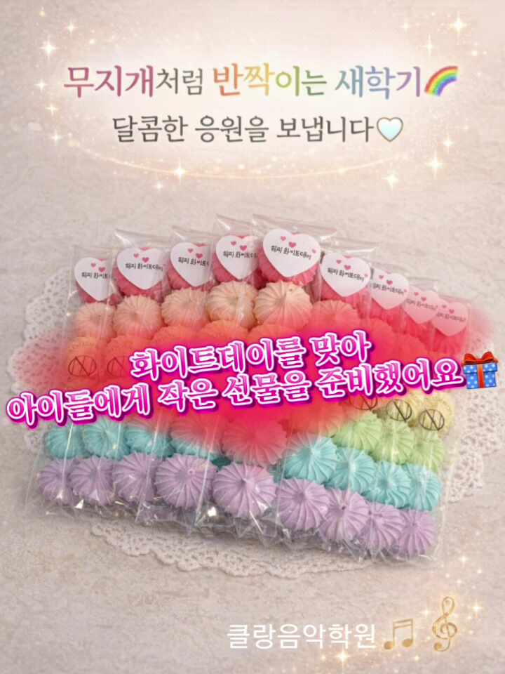 안녕하세요. 클랑음악학원입니다 저희 학원은 송정초등학교 정문 앞 2층 에 위치해 있어요 아이들이 학교 끝나고 편하게 들를 수 있는 곳에 있습니다. 새학기가 시작되면서 학교 앞도 다시 활기가 느껴지기 시작했네요. 아이들의 밝은 목소리가 들리니 봄이 온 것 같은 기분이예요 아직은 꽃샘추위가 남아 있지만, 날씨도 점점 따뜻해지고 아이들도 새로운 시작에 설레어 하는 모습이에요 마침 새학기 시작과 함께 화이트데이가 있어 아이들에게 작은 선물을 준비해 보았습니다. 무지개처럼 알록달록한 머랭쿠키입니다 새학기를 시작하는 아이들에게 “응원하고 있어”라는 마음을 전하고 싶었어요. 저희 학원은 단순....... <img src="https://phinf.pstatic.net/image.nmv/blog_2026_03_14_2647/hWMzCde20d_03.jpg?type=f480x480" />