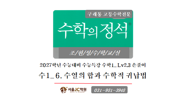 [구래동 수학의 정석] 서울JC학원_2027대비 수능특강 수1 Lv2.3 손풀이_6.수열의 합과 수학적 귀납법 #김포구래동수학학원 #고등수학전문학원 #서울대원장직강 #원장직강 #김포고등수학 #구래동수학학원 #대치동수준수업 #수학성적향상 #김포수학과외대체 #솔터고 #양곡고 #호수고 #신양고 #김포고 #장기고 #운유고 #통진고 <img src="https://blogthumb.pstatic.net/MjAyNjAyMjhfMjg3/MDAxNzcyMjc4NTc1OTQ2.oRFCsZVTo6aTCOdMd5_biPArjxt8tldWnHYgoPZ4t_kg.BKRGq_6myGq3MuHnu_O3ZdLqu_E3ZNG8ZxG88ok8X58g.PNG/image.png?type=s3" />