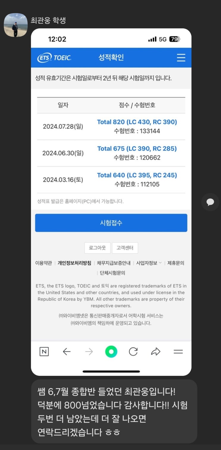 안녕하세요 취업을 목표로 토익 점수가 급하게 필요했던 수강생입니다. 2개월 동안 만점토익학원을 수강했던 후기를 남깁니다. 체계적인 커리큘럼과 알찬자료 RC어휘와 문법 핵심만 모아둔 자료가 정말 큰 도움이 되었습니다. 특히 700점대에서 800점대에 올라갈려면 양질의 자료가 필수인데 만점토익학원에서는 불필요한 내용을 걷어내고 시험에만 나오는 것만 집중하게 해줘서 효율적이었습니다. RC보다 취약했던 LC에서 파트별로 어떤 함정에 유의해야 하는지 어떤 키워드를 놓치지 말아야 하는지 명확하게 알려주셔서 점수가 빠르게 오를 수 있었습니다. 2 빡센 숙제관리 매일 단어시험과 숙제검사를 통해 혼자했다면 무너졌을 꾸준함을 잡아....... <img src="https://blogthumb.pstatic.net/MjAyNTEyMDlfMjYz/MDAxNzY1MjEzNDUzMTA5.dXyRjNsP8j63_XSMXI4eVjnrTNRCRgCMViAW-sjbRJsg.BNZUjSf9BJVtg6bx0VkOsdEgDrnBdDCF47w1BadA87gg.JPEG/KakaoTalk_20240807_192635791_01.jpg?type=s3" />