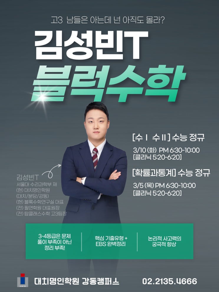 [대치명인강동캠퍼스] 고3 수능 수학의 퍼즐을 맞추다! 김성빈T '블럭수학' 정규반 개강 안내 안녕하세요, 대치명인학원 강동캠퍼스입니다. 새 학기가 시작되고 본격적인 수능 대비가 한창인 지금, "남들은 다 아는데 나만 모르는" 수학의 빈틈 때문에 고민하고 계신가요? 특히 3~4등급대 학생들은 문제 풀이 양이 부족해서가 아니라, 지금까지 배운 개념들이 머릿속에서 체계적으로 정리되지 않았기 때문인 경우가 많습니다. 수능 수학의 흩어진 조각들을 하나의 완벽한 논리로 맞춰줄 **김성빈 선생님의 [블럭수학]**을 소개합니다! 김성빈 선생님이 말하는 '블럭수학'의 핵심 수학은 기초 블럭을 어떻게 쌓....... <img src="https://blogthumb.pstatic.net/MjAyNjAzMTdfMjU5/MDAxNzczNzQyMjQ0ODA1.5ItKgHM8uow_w-NMmxy1hPFgL_UJ3xrXFCdCbAMOE2Qg.akrmxFxG6YUBmHxNvGG0t3ZXiA-XkJ2l2QlGaNxtA5Yg.JPEG/%B1%E8%BC%BA%BA%F3T.jpg?type=s3" />
