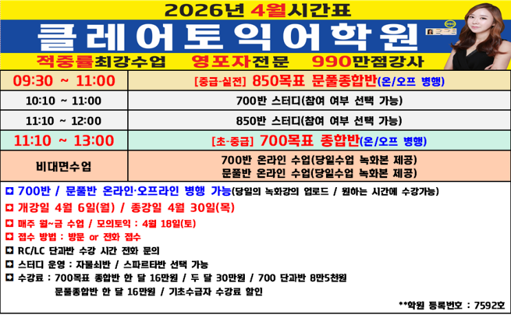 [전주토익학원]클레어토익 26년 4월 시간표