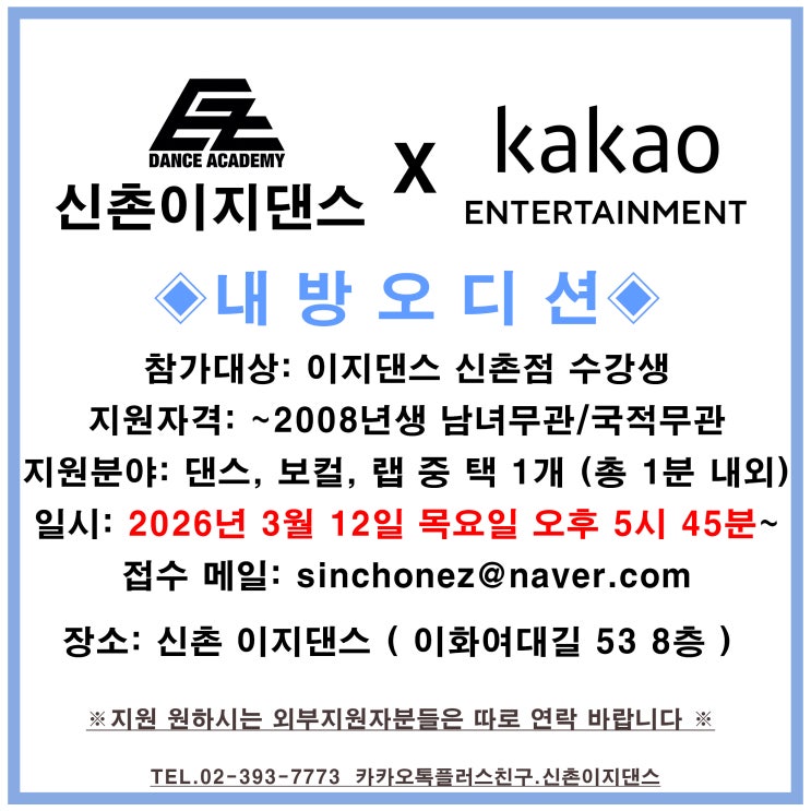 #홍대댄스학원 #이지댄스신촌점 26년 3월 #내방오디션 #비공개오디션 일정 안녕하세요 :) #랭키닷컴 1위 20년 경력의 #댄스학원 #신촌이지댄스 입니다 - 저희 홍대댄스학원 이지댄스신촌점에서 이번 3월도 내방오디션이 진행되는데요! 이번에 진행 될 회사는 바로바로,, #카카오엔터테인먼트 #KAKAOENTERTAINMENT 입니다! 일시 : 2026년 3월 12일 목요일 PM5:45~ 지원 자격 : ~2008년생 / 남녀 , 국적 무관 지원 분야 : 댄스, 보컬, 랩 중 택 1개 (총 1분 내외) 이며, 지원 원하시는 외부지원자분들은 TEL.02-393-7773 또는 카카오톡 플러스친구 . 신촌이지댄스 로 문의주세요:) 홍대댄스학원 이지댄스신촌점에서는 매달 #내방오디션 이 진행....... <img src="https://blogthumb.pstatic.net/MjAyNjAyMjdfMjA5/MDAxNzcyMTg4MTE0NjA2.THPOEDyqY77IQfKzgOOsEbLKc6YN4gygxZ3_QJEqvTQg._ko9_fEJsMeDVpouo0K0m5h8GqWPEv9nvDc3JPKak4cg.JPEG/26%B3%E2-%C4%AB%C4%AB%BF%C0-%B3%BB%B9%E6%BF%C0%B5%F0%BC%C7-%B0%F8%C1%F6.jpg?type=s3" />