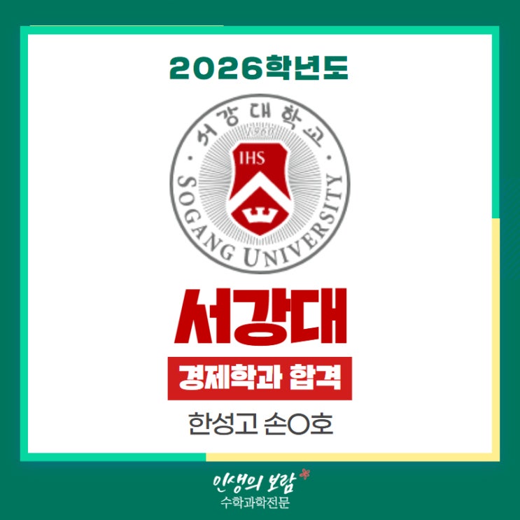 안녕하세요 인생의보람 수학과학 전문학원 본원입니다. 오늘은 무려 9.44:1의 경쟁률을 뚫고 서강대 경제학과에 합격한 한성고 손0호 학생의 소식입니다. 한성고 물리 화학 전교 1등 손0호 서강대 경제학과 합격 손0호 학생은 인생의보람에서 물화생을 모두 수강했으며 물리와 화학에서는 각각 전교 1등을 받아내었었는데요! 인생의보람에서 화학과 생명 수업을 함께하는 동안 한 번도 1등급을 놓친 적이 없습니다. 물리 또한 인생의보람과 수업을 함께한 순간부터 2등급에서 -> 전교 1등으로의 빠른 성적 향상을 이뤄냈습니다. 한성고 재학생의 빠른 성적 향상 비결 1. 한성고 맞춤 내신 대비 한성고는 과학 관련 프로그램을 많이 진행하며 과....... <img src="https://blogthumb.pstatic.net/MjAyNjAxMTlfMTIw/MDAxNzY4ODA4NTU5MDYx.PEa5d-bqXmDMnduucQ-7DZSBjeqI1f4dgkqUWD6bAIMg.yxG0GOQNcX21EFJYp4kO3M8h7IFW7L8r0KybXBfVkxIg.JPEG/2026_%BC%D5%C1%D8%C8%A3_%BC%AD%B0%AD%B4%EB.jpg?type=s3" />