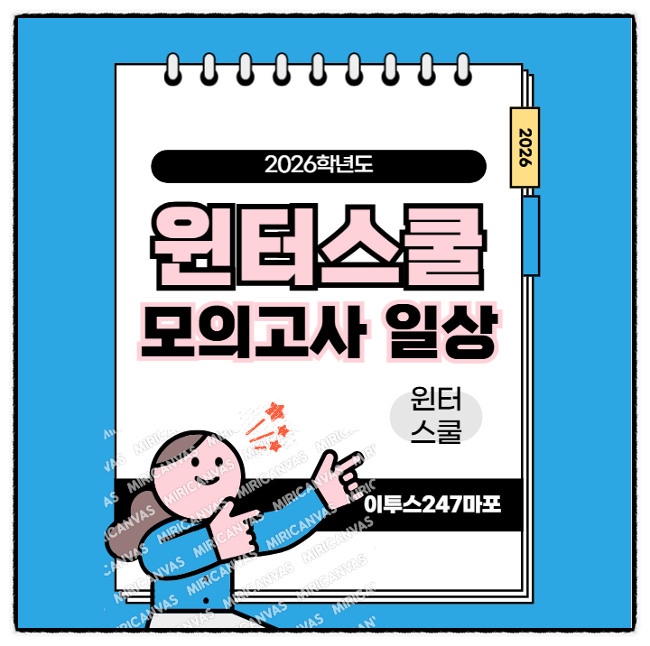 안녕하세요 이투스 247 마포학원입니다. 오늘은 2026년 윈터스쿨 모의고사 실시일입니다. 윈터스쿨이 시작된지도 벌써 3주가 지났네요~ 고1,고2 학생들은 이투스 모의고사로~ 고3 학생들은 대성 더프리미엄 모의고사로 진행됩니다. 오늘 보는 모의고사는 국수영 3과목만 응시합니다. 모두 다 진지한 자세로 참여해주시기 바랍니다. 오늘 실시하는 윈터스쿨 모의고사는 점심 식사 시간 관계로 20분 앞당겨 시작합니다. 1교시 국어영역 - 08:20 ~ 09:40 (80분) 2교시 수학영역 - 10:00 ~ 11:40 (100분) 3교시 영어영역 - 13:10 ~ 14:20 (70분) 시험 시간 착오 없으시기 바랍니다. 1교시 국어영역이 시작되었습니다. 한 지문 한 지문 꼼꼼하게 읽고....... <img src="https://blogthumb.pstatic.net/MjAyNjAxMjZfMTMg/MDAxNzY5MzkzNDI2MDcx.0KIxUJMIKk1oY_t2ydgCjy9k40o4hhc8caNHclX5Uqwg.0DmlIXCdTWRsgE_MuOOtyzxYz2Y9tvkCgmOse1Q0mPQg.PNG/image.png?type=s3" />