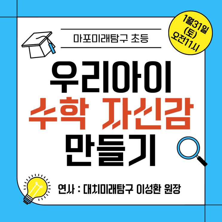 수학 고민? 대치미래탐구 원장이 떨쳐드립니다!! 우리아이 수학 자신감, 어디서부터 만들어야 할까요? “문제는 풀리는데, 조금만 어려워지면 손을 놓아요.” “틀리는 걸 너무 무서워해요.” “수학을 싫어하진 않는데, 자신이 없어 보여요.” 예비 초3~5 시기는 수학 실력보다 ‘수학에 대한 태도와 자신감’이 굳어지는 결정적인 시기입니다. 이 시기를 어떻게 보내느냐에 따라 ✔️ 고학년 수학 적응력 ✔️ 심화·사고력 수학으로의 확장 ✔️ 낯선 문제를 버티는 힘 이 완전히 달라집니다. 대치 현장에서 검증된 ‘수학 자신감 설계’ 이번 설명회에는 대치미래탐구 원장님이 직접 오셔서 수년간의 대치 현장 경험을 바탕으로, 왜 아이가 수....... <img src="https://blogthumb.pstatic.net/MjAyNjAxMjdfMjcg/MDAxNzY5NTEyOTc5MjMy.WxmD1_J-Yjhf12GwcVpHHdTIEc7KClMt_XTixhC6GKIg.KpmqMpW2CsyQ0LJWlUqaXg4B702DGIkEz9wJDRLqo54g.PNG/%C1%A6%B8%F1%C0%BB_%C0%D4%B7%C2%C7%D8%C1%D6%BC%BC%BF%E4._%287%29.png?type=s3" />