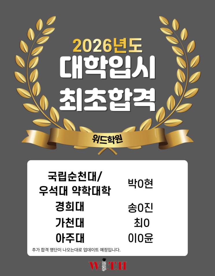 안녕하세요 위드학원입니다:) 2026년 대학교 최초합을 성공한 학생들을 소개시켜드립니다! 그동안 열심히 달려온 학생들 너무 수고많았고 앞으로도 행복한 일만 가득하기를 바랍니다. <img src="https://blogthumb.pstatic.net/MjAyNTEyMTNfMTM0/MDAxNzY1NjE2Mzk3ODg2.lclJ5kHVqpj0P6wBo64lMsTRlq8MgWeguiTK_F6qf1Yg.s8zf74iPqe7xwwHzJpyIDVha59GZ_iZpe6B3MnJ_Vwog.PNG/%C1%A6%B8%F1%C0%BB-%C0%D4%B7%C2%C7%D8%C1%D6%BC%BC%BF%E4_-001_%2813%29.png?type=s3" />