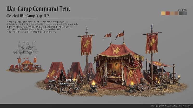 장00 수강생 중세 전쟁 캠프 프랍 포트폴리오 장00 수강생의 중세 전쟁 캠프 프랍 세트 작품이 완성되었습니다. 이번 작업은 단일 오브젝트가 아닌 전쟁 캠프라는 하나의 세계관을 구성하는 프랍 세트 기반 포트폴리오입니다. 컨셉 → 구조 설계 → 디테일 → 완성까지 실무 프로세스를 그대로 반영한 작업입니다. 컨셉 설계 능력 이번 작품은 단순 프랍 나열이 아니라 ✔ 감시탑 (Watchtower) ✔ 지휘 천막 (Command Tent) ✔ 공성 무기 (Iron Beast) ✔ 처형대 / 감옥 구조물 ✔ 보급 마차 / 야전 식당 처럼 역할이 명확한 구조물 중심으로 구성되었습니다. 각 프랍이 전투 준비 통제 보급 공포 연출 이라는 기능을 가지며....... <img src="https://blogthumb.pstatic.net/MjAyNjAzMTdfMjA2/MDAxNzczNzM5Mjk1ODI0.p-JlfMyrD61SPEckNZy_0VZBRi8ftfGn6TW-88ennxsg.EpvqasB40ABnI-e8AxmYRw-lWC9qwR61BgCCoTMehdEg.JPEG/%C1%DF%BC%BC_%C7%C1%B6%F8_%BD%C3%C6%AE_%BA%B4%BF%B5_7.jpg?type=s3" />