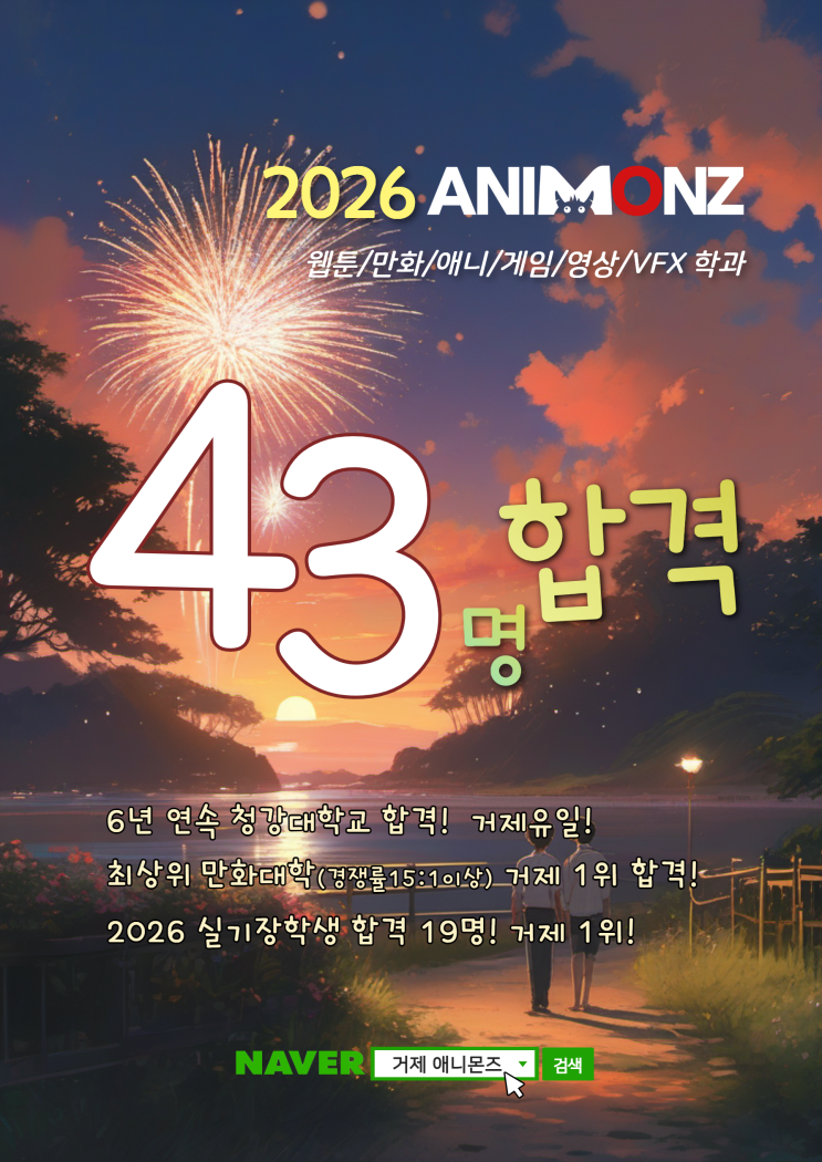 거제 웹툰/애니/게임/VFX 입시1위 애니몬즈 만화학원 2026 43개 대학 합격 안녕하세요~ 거제를 대표하는 만화입시학원 애니몬즈 입니다. 만화입시 사상 최고의 경쟁률을 기록했던 2026 입시가 모두 끝이 났습니다. 저희 애니몬즈는 거제-통영 지역 합격 1위(4년연속)라는 결과를 올해도 만들어냈습니다. 경쟁률 15 : 1 이상의 최상위 대학은 물론, 6년 연속 청강대학교 합격이라는 거제 유일의 기록을 만들어낸 애니몬즈 입시생, 학부모님, 강사진 여러분 모두 고생많으셨습니다. 다가오는 2027 입시에서도 1위를 또한번 뛰어넘는 합격 결과를 만들어 내겠습니다. 2019/2021/2022/2023/2024/2025/2026 6년 연속 청강대학교 합격 2026 경쟁률 15 :....... <img src="https://blogthumb.pstatic.net/MjAyNjAyMTlfMTIy/MDAxNzcxNDc3MjQ5MzU0.VacCoIa282GXx7aK3jqbBRSeH-1zesxY5oE3cOZsPl8g.z3osXdVJ6sVV8SZvor4JuMjOavICLxJnOT_p5h_ruXog.PNG/%B0%C5%C1%A6%B9%CC%BC%FA%C7%D0%BF%F8_%BE%D6%B4%CF%B8%F3%C1%EE%B8%B8%C8%AD%C7%D0%BF%F8_2026%C7%D5%B0%DD_43%B8%ED%C7%D5%B0%DD.png?type=s3" />