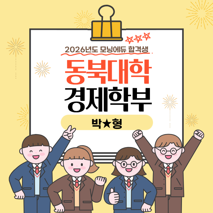 안녕하세요, 정확한 티칭으로 목표 대학을 높이는 모닝에듀입니다. 오늘은 동북대학 경제학부 박O형 학생의 후기를 가지고 왔습니다. 한국 입시와 일본 입시 사이에서 고민하다가 일본 입시를 선택했고, 주변에 연연하지 않고 자신의 길을 묵묵히 걸어 좋은 결과를 이룬 입시 스토리입니다! 박O형 학생의 합격을 진심으로 축하드리며, 긍정적이고 진중한 자세로 많은 것을 배우고 성장하는 대학생의 모습도기대할게요!! 안녕하세요. 동북대학 경제학부에 합격한 박O형이라고 합니다. 제 경험이 후배분들께 도움이 되었으면 합니다. 일본 유학 준비를 하던 친구 제가 일본 유학을 준비하게 된 계기는 고등학교에서 일본 유학 준비를 하는 한 친구....... <img src="https://blogthumb.pstatic.net/MjAyNjAzMTJfOTgg/MDAxNzczMjg5NzU4MjIw.gGRw4MRrBESKEoZZwQdcnrZoI-z9B-rCbA8csLYRQX0g.r2GgZn6fy-J2JyT7ntv2IdrenBgyPhPZ169EJlwejycg.PNG/2025.png?type=s3" />