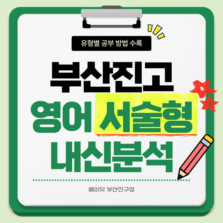 반갑습니다. 수많은 학생들의 영어 성적 향상을 만들어 내며 차별화된 방법으로 영어를 가르치고 있는 영어 성적 향상 전문가 에이닷 이주영 원장입니다. 쉬운 서술형은 답을 적었지만, 어려운 서술형 문제는 너무 막막했어요. 대체 그런 문제는 어떻게 준비해야 하죠? 아주 쉬운 서술형 1번 문제에서부터 자신의 생각을 스스로 영작해야 하는 서술형 3번 문제까지 이번 부산진고 서술형 문제의 난이도의 차이는 매우 컸는데요. 서술형을 위한 영작 실력이 제대로 쌓여 있지 않았다면 서술형에서 감점이 나오기 쉬운 시험이었습니다. 보기가 있어서 그중에 고를 수도 없고, 심지어 문제조차 영어로 출제되며 자신의 생각을 스스로 영....... <img src="https://blogthumb.pstatic.net/MjAyNjAyMjdfMTUx/MDAxNzcyMTg1ODA5NzAy.qqan2dNUFeiJ4WO7ZqBjHht_z33UzTWH_YlgysJ4aR4g.cPSISQwAQwE6adXqcegBhvqvQ5l-oG86QNY6g559JgQg.JPEG/20260227-1.jpg?type=s3" />