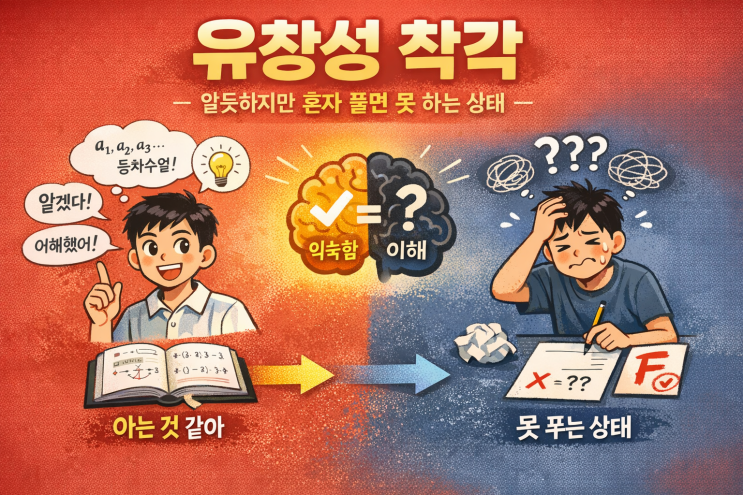 수업을 하다 보면 학생들이 가장 많이 하는 말이 있습니다. “선생님, 이해했어요.” 설명을 할 때 고개를 끄덕이고, 풀이를 보면서는 고개를 크게 끄덕입니다. 그래서 물어봅니다. “정말 이해했어?” 학생들은 자신 있게 말합니다. “네!” 그런데 바로 다음 문제를 풀어보라고 하면 갑자기 연필이 멈춥니다. 아까는 분명 이해했다고 했는데 왜 문제를 풀지 못할까요? 이것을 ‘유창성 착각’이라고 합니다 인지심리학에서는 이런 현상을 **‘유창성 착각(Fluency Illusion)’**이라고 부릅니다. 풀이를 보면 이해가 되는 느낌이 듭니다. 설명을 들으면 알 것 같은 기분이 듭니다. 하지만 그건 실제 이해가 아니라 풀이를 따라간 것뿐입니다. 우....... <img src="https://blogthumb.pstatic.net/MjAyNjAzMDVfMTQx/MDAxNzcyNjkyOTE1MDE2.7cfdVc-hTLo6XE0Psn6H9pqkdEoqw5e4Fpn-MD3I6fUg.7yiuuvGafhJe9AsTS_y3fRjZ3cZQGwJ28sEwiZIIGjYg.PNG/ChatGPT_Image_2026%B3%E2_3%BF%F9_5%C0%CF_%BF%C0%C8%C4_03_41_41.png?type=s3" />