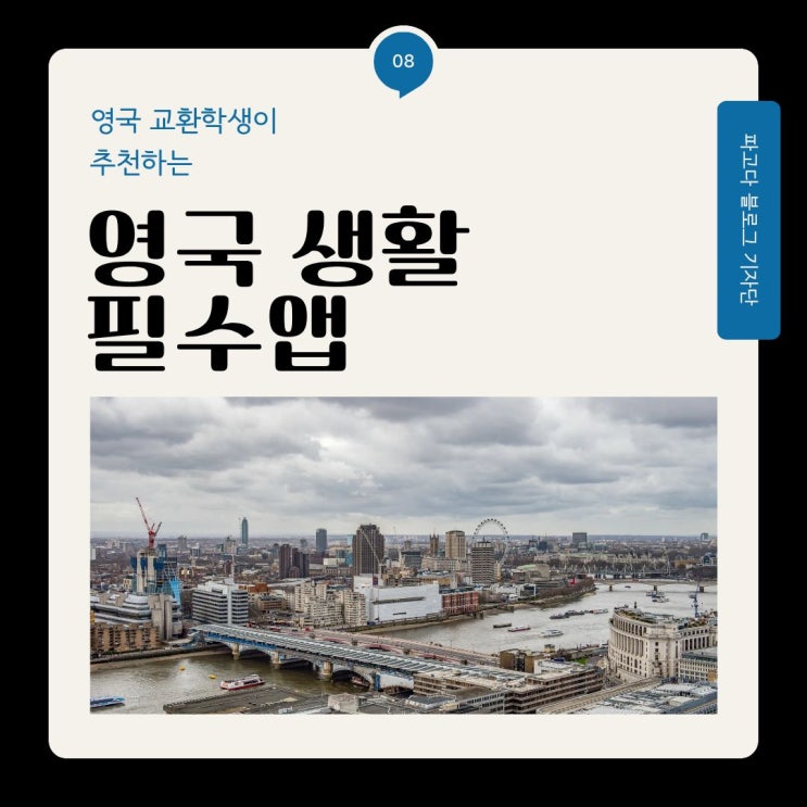 안녕하세요, 파고다 블로그 기자단 최유진입니다. 영국에 교환학생으로 온지 어느덧 3주가 되며, 영국 생활에 적응하며 느낀 필수앱들이 있습니다. 이번에는 약 한 달간 생활하며 느낀 영국 생활 필수앱들을 소개해 볼게요! 생활용품 소비 관련 앱 영국은 외식 물가가 비싼 편이라 직접 요리해 먹는 것이 흔합니다. 저 역시 영국에 도착한 이후 외식은 거의하지 않고 마트를 자주 방문하고 있습니다. 그래서 마트 멤버십에 가입해 적립이나 할인을 받는 것을 추천드려요. 리즈대학교 근처에는 Tesco Exress와 Morrison 매장이 있는데요. Tesco Express는 앱을 통해 멤버십(Clubcard)을 등록하면 할인 혜택을 받을 수 있어 꼭 가입하는 것이 좋....... <img src="https://blogthumb.pstatic.net/MjAyNjAyMDlfMjc5/MDAxNzcwNjEwNzQ0MDk0.8nAbrFzIEUGLNdMagCiK2T-N0s7oSpeIaF46POZFfbEg.G4nokN__kzQn9j_5VY1mbeqXP2ckHKNIoaiD2cmRqCAg.JPEG/1_%287%29.jpg?type=s3" />