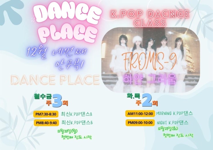 대구칠곡댄스학원 댄스플레이스 입니다:) 벌써 12월의 끝자락을 향해 가고 있습니다. 올해의 마지막 달, 그리고 한 해를 마무리하는 이 시점에 댄스플레이스 방송댄스 성인취미반도 12월 마지막 안무곡, 단 한 곡만을 남겨두고 있습니다. 매달 새로운 음악과 안무로 회원님들의 일상에 즐거움과 에너지를 더해드리고 있는 댄스플레이스 방송댄스 성인취미반은 12월에도 정말 알찬 커리큘럼으로 수업이 진행되었습니다. 12월 방송댄스 성인취미반 안무 정리 ✔ 첫 번째 안무곡 올데이프로젝트 – ONE MORE TIME 12월의 시작을 강렬하게 열어준 곡으로 리듬감과 파워를 동시에 요구하는 안무였습니다. 몸을 크게 사용하면서도 디테일이 살아 있....... <img src="https://blogthumb.pstatic.net/MjAyNTEyMjBfMTM3/MDAxNzY2MjEwODgzMjU3.ZKCRwxksgigX00GsI7VKUK3Ow2vVObSoF_Ho2N6bwvYg.Hd5KCOK2BjB9H7IfmDa2gNcHYzVGsrLHehH89OHNVN0g.JPEG/FROI.jpg?type=s3" />