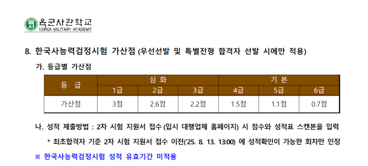 안녕하세요, 대구 북구 칠곡3지구 영어학원, 대구 북구 칠곡 3지구 독학재수학원, 대구·경북 사관학교 전문양성학원, 대구 북구 유일 공군사관학교 생도 배출 학원 [김철영어학원]입니다. 오늘은 사관학교 준비생 여러분께 “사관학교 한능검: 한국사능력검정시험”에 대해 말씀드리려 합니다. 사관학교 입시에서 한능검(한국사 능력검정시험)은 “있어도 되고 없어도 되는 옵션”이 아닙니다. 한능검 3급 이상은 사실상 필수 조건입니다. 사관학교 최종 전형에서 한능검 등급이 없으면 불리하고, 대부분의 수험생들은 3급 이상을 확보한 상태로 지원합니다. 그.러.나. 현장에서 실제 학생들의 현실적인 기준은 조금 다릅니다. 먼저 결론부....... <img src="https://blogthumb.pstatic.net/MjAyNTEyMjJfMjQx/MDAxNzY2MzkzNDQyNDIz.fZysaC61wT1XkRzluHR8VIWfyYgWTv44JBAYHb24Fbsg.tC0QzcsPtLOrSmELTdQ1ECIAOoFEinr6KvdjJTwu3Hkg.PNG/image.png?type=s3" />