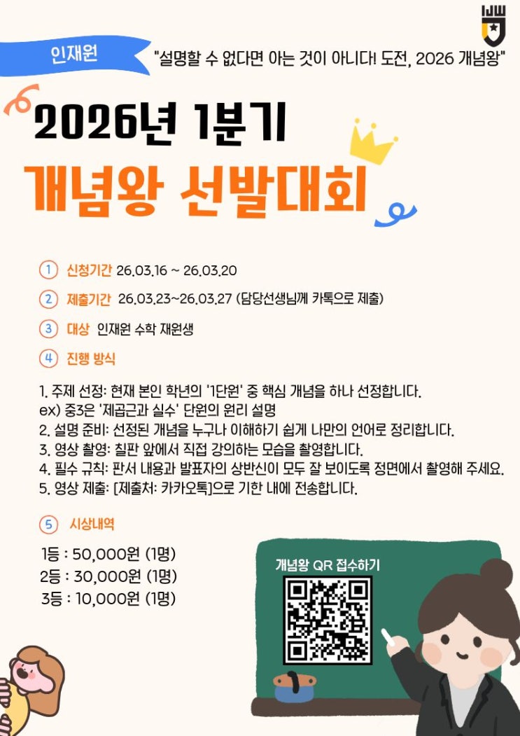 수학 공부에서 가장 중요한 것은 개념을 정확하게 이해하는 것입니다. 그리고 진짜로 개념을 이해했는지는 다른 사람에게 설명할 수 있는지로 확인할 수 있습니다. 안녕하세요. 침산동 수학학원 인재원입니다. 개념왕 선발대회가 다시 돌아왔습니다! 인재원에서는 학생들이 스스로 개념을 정리하고 설명하는 경험을 통해 수학을 더 깊이 이해하도록 지도하고 있습니다. 이러한 학습 경험의 효과를 극대화하기 위해, 개념왕 선발대회라는 행사를 작년부터 진행해 왔는데요. 많은 학생들이 참가했고, 열정도 뜨거웠던 기억이 납니다. 그리고 올해도 모두가 기다렸던 2026년 1분기 개념왕 선발대회가 개최됩니다! ❚ 개념왕 선발대회란? 개념왕 선발....... <img src="https://blogthumb.pstatic.net/MjAyNjAzMTZfMTY1/MDAxNzczNjU0OTQwNzkx.5ye9ryU7eX7Z9zD91iHEfo2WdMN7bYAypjEehFbFbvgg.w7-E5CR9ZOZNwq9ztBSQSFgT-3SRdv-ickdAZZ5txqQg.JPEG/2026%B3%E2_%C0%CE%C0%E7%BF%F8_%B0%B3%B3%E4%BF%D5_%281%29.jpg?type=s3" />