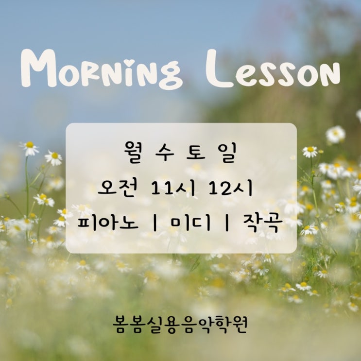 대구 침산동에 위치한 봄봄실용음악학원 오전레슨을 안내드립니다 월, 수, 토, 일 11시, 12시에 개설되어 있으며 수강 가능한 과목은 피아노 | 미디 | 작곡 입니다 피아노 는 연주곡, 클래식, 재즈피아노,반주법 등 왕기초부터 전공자까지 맞춤수업을 진행합니다 미디 는 로직 프로그램을 이용하여 비트메이킹, 카피, 편곡, 자작곡완성 등 원하시는 내용으로 수업을 구성합니다 화성학 및 코드구성음, 연결 등을 병행해서 배우게 됩니다 작곡 은 피아노를 이용한 작곡수업으로 연주곡 또는 보컬곡을 주로 만드는 수업입니다 화성학과 피아노 편곡법 등을 병행해서 배우게 됩니다 수업은 주1회 정기적으로 또는 원데이 수업도 가능합니다 <정기....... <img src="https://blogthumb.pstatic.net/MjAyNjAzMDFfMjEy/MDAxNzcyMzYyMTE2NDAz.BvHKJSy1CV_H7pz8PYxB_6lDIZ2gUpdoS2GzrZMEEVAg.54F3q91w4QtpJjXHDu3APDccFMysUd1IOll-t30G3gEg.JPEG/%B8%F0%B4%D7%B7%B9%BD%BC.jpg?type=s3" />