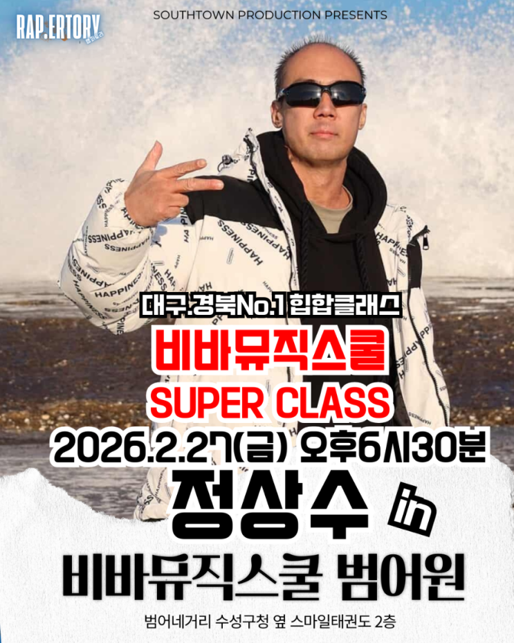[SPECIAL CLASS] 힙합의 아이콘, '정상수'가 비바뮤직스쿨에 뜬다! 대구·경북 No.1 힙합 클래스의 위엄! 비바뮤직스쿨에서 정상수 작가의 특별한 힙합 특강을 개최합니다. 왜 비바여야만 할까요? 그 정답은 바로 오종수 대표님께 있습니다. 정상수의 대표 명곡인 [달이 뜨면], [명사수], [부산을 대표해] 등의 작·편곡은 물론, 음반 제작 전반과 매니지먼트를 직접 진두지휘하셨기 때문이죠! 이토록 깊은 인연과 전문성을 바탕으로, 어디서도 들을 수 없는 진짜 힙합 이야기를 여러분께 공유합니다. 일시 및 장소 일시: 2026년 2월 27일(금) 오후 6시 30분 장소: 비바뮤직스쿨 범어원 (범어네거리 수성구청 옆, 스마일태권도....... <img src="https://blogthumb.pstatic.net/MjAyNjAyMjdfOTIg/MDAxNzcyMTQ3NjU1OTg3.Ft26t9T838u2VPw9nveqrtKGLZ6JEFYF5p7S-S5Xx58g.koA_Svy6jDTTxfQMTA7BFgAVYInLzcCeZbX6wep45pAg.PNG/900%A3%DF1772119993853.png?type=s3" />