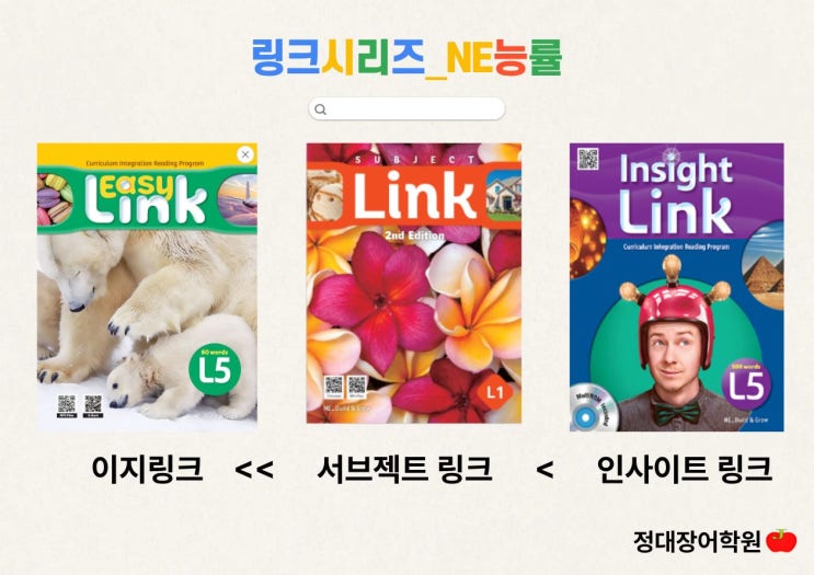 안녕하세요 다사 대실역 영어학원 정대장어학원 세천 영어학원 세천정대장어학원 입니다. 학부모님들이라면 다들 “ 엄마표 영어로 쓸 만한 리딩 교재 없을까? ” “ 우리나라 교과 내용을 영어 교재로 공부 할 수 있는 책이 있을까?” 라는 생각을 한 번쯤 해보실 거 같은데요 오늘은 방과후 영어, 어학원, 심지어 사립학교에서도 교재로 썼던 링크 시리즈를 소개해드릴게요. 1. 링크 시리즈 교재의 특징 능률 출판사에서 만드는 대표적인 교재로 크게 - 서브젝트 링크 (Subject link) - 인사이트 링크 (Insight Link) 두 종류로 이루어져 있습니다. 둘 다 주제별 통합교과과정을 제공하고 있는데, 하나의 주제로 연결된 여러 교과목들을 통합해....... <img src="https://blogthumb.pstatic.net/MjAyNjAzMTZfOTEg/MDAxNzczNjQwMTI2ODM2.auUSfQPfqcKuijlE0RPSnHEdVguMQ4HBPCte3m3wFTEg.SXdVYu05fX_zrVf6RufGKuJTt0HIHqhd4l_MPfEq2gsg.JPEG/%C1%A6%B8%F1%C0%BB_%C0%D4%B7%C2%C7%D8%C1%D6%BC%BC%BF%E4..jpg?type=s3" />