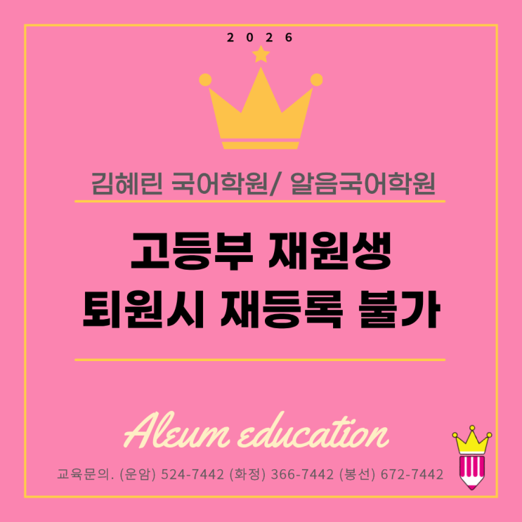 안녕하세요 알음교육(김혜린국어)입니다. "고등부 재원생은 퇴원 시 재등록이 불가합니다." 광주 뿐만 아니라 전국의 어느 학원에서도 쉽게 적용하지 못하는 운영 원칙을 저희는 고수하고 있습니다. 왜 '알음교육'은 재등록 불가 원칙을 고수할까요? 알음교육은 '스스로 사고하는 힘'을 가르칩니다 알음교육은 학생이 스스로 생각하고, 분석하며, 사고하는 연습을 무엇보다 우선하여 지도하고 있습니다. 짧은 쇼츠와 릴스에 익숙해져, 옳고 그름을 판단하기보다 정보를 있는 그대로 받아들이는 환경에서 자란 아이들. 이런 아이들에게 스스로 생각하는 연습은 어른들이 생각하는 그 이상으로 매우 고통스러운 과정....... <img src="https://blogthumb.pstatic.net/MjAyNjAyMDRfMjcg/MDAxNzcwMTk1NDMyMzI0.5tNVgD3GyNpkLgb3tP2YhM6m7fVMr6b6Yz9tyd59DqEg.KkmOEzlPyXUxljDdSB8mXRD1wgGE3Kvp5Io1Gw_uJfwg.PNG/%C1%A6%B8%F1%C0%BB_%C0%D4%B7%C2%C7%D8%C1%D6%BC%BC%BF%E4._%283%29.png?type=s3" />