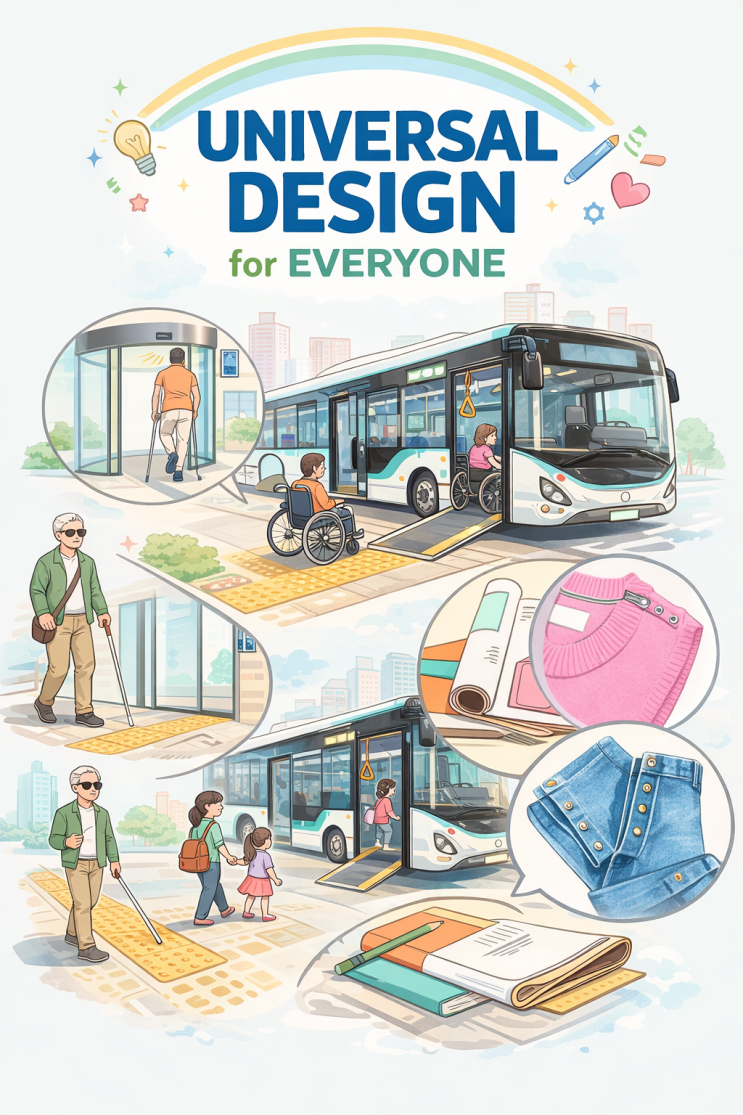 근명고등학교 1학년 공통영어1 1과 분석 Universal Design for Everyone – 모두를 위한 디자인 근명고등학교 1학년 영어 교과서의 첫 단원은 **Universal Design(유니버설 디자인)**이다. 이 단원은 단순한 독해 지문이 아니라, 사회적 의미와 함께 관계사, that절, 수동태, 목적격 관계사 구조 등 실제 시험에 자주 출제되는 문법 요소가 집중된 핵심 단원이다. 시험에서는 내용 이해뿐 아니라 문장 구조 해석 능력을 동시에 평가하는 특징이 있다. 1. 단원의 핵심 주제 이 단원의 중심 질문은 다음과 같다. “모든 사람이 불편 없이 사용할 수 있는 환경을 만들 수 있을까?” 지문에서는 먼저 왼손잡이 사례를 제시한다. 전 세계 인구의 약 10....... <img src="https://blogthumb.pstatic.net/MjAyNjAyMjZfMjQ2/MDAxNzcyMDk0NjE4MTUx.rojAswP-lX1YRH7yHhUvMynqYKS5uzI2QA2VESHQ1O0g.a5djxZxpMV6z00Q9-ze9GaKl7B8qOhjrbSSMKPskO5wg.PNG/%B1%D9%B8%ED%BF%B5%BE%EE1%B0%FA%BD%E6%B3%D7%C0%CF.png?type=s3" />