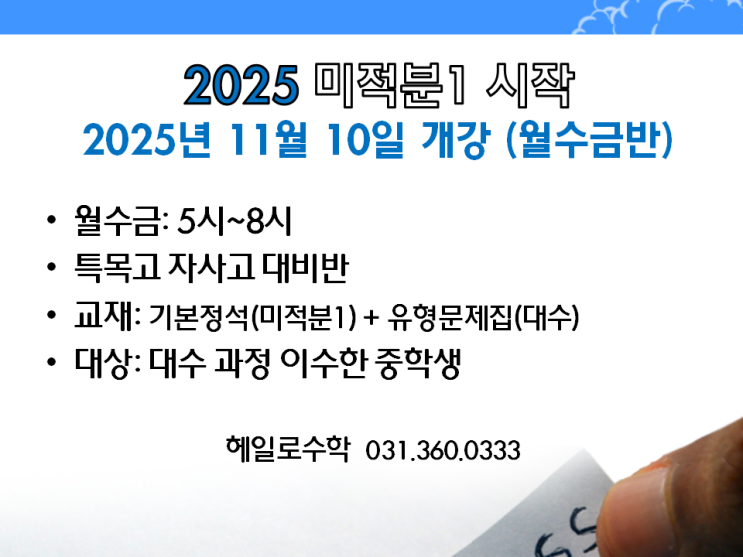 헤일로수학에서 미적분1반 모집합니다. 월금(미적분1 개념), 수(대수 문제풀이) 수업입니다. 2025년 11월 10일(월)에 개강해서 진행하고 있습니다. 같이 공부할 친구 모집합니다. 정원은 9명입니다. ★ 중등 2-2 개념반도 월수금 7시에 진행하고 있습니다. 학원으로 상담전화 주시면 자세히 알려드리겠습니다. <img src="https://blogthumb.pstatic.net/MjAyNTExMTNfMTMx/MDAxNzYzMDMzMDc3MzEw.c2j63mVS46NyZtAgYIUTL9RGCHVvsfoJZH-qToUMQswg.47dJ82urDADAEZUcrUCecKNfGNn8oY-0qmR4OCtRGdwg.PNG/202511_dif_start.png?type=s3" />