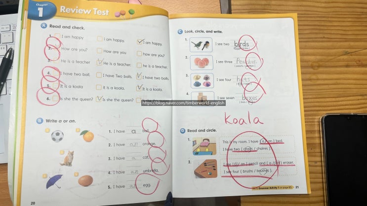 우리학원 오마초 1학년 학생의 문법 일지!!! 작년 2학기에 등록해서 알파벳, 파닉스부터 차근차근 나간 친구 문법도 나가도 괜찮다 싶어서 추천했지만 문법이라는 두려움에 ? 무섭다고 안한다고했지만 샘과 엄마의 설득에 넘어가서 시작^^ 그런데... 한번 하더니 매일 문법책만 펴네요... ㅎㅎ 재밌다고 숙제도 알아서 해오고 푸는 족족 다 맞더니 5학년 형이 하는 문법책하는 것이 목표라면서 결국 1권을 한달 반만에 마치고 2권에 들어갔습니다. 총 3권으로 이루어진 문법책을 다 마치면 형이 하는 문법책을 나가도 되냐고 :) 이렇게 매일매일 일취월장하는 팀버월드 . . . . . . . . . . . . . 그리고 George 스피킹시간에는 오늘 어떤 것을 배....... <img src="https://blogthumb.pstatic.net/MjAyNjAxMjZfMjQ5/MDAxNzY5NDIxMjU1OTc1.EpYdffROREkAWPpcQlyVGdy6tKDCjsfu5dFyuD7FWTgg.Rzd-fJR_dL_oS93U-oZAJiiz7BcDx0NkgUcKQEubidMg.JPEG/KakaoTalk_20260126_184900656_06.jpg?type=s3" />