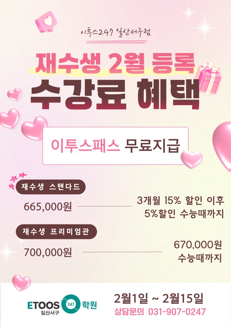 안녕하세요. 이투스247 일산서구점입니다. 재수생 2월 등록 수강료 혜택 안내 드립니다. 2월15일까지 등록할 경우 프리미엄관 700,000원 -> 3만원 할인 670,000원 (수능때까지 계속) 스탠다드실 665,000원 -> 15% 할인 (3개월) 565,250원 (수능때까지 5% 할인 적용) 이투스패스까지 제공됩니다. 감사합니다. <img src="https://blogthumb.pstatic.net/MjAyNjAxMjdfNDYg/MDAxNzY5NDg5MjI2OTUx._HHNVWkEo_Oj727KMJUJR1v7HuSvwF2HeHqxCfwCh2Ag.6OK_mJxMpKOLyCNvbTiDQcgEYgMYt1tAn3xKBxBVoKcg.JPEG/afasefa.jpg?type=s3" />