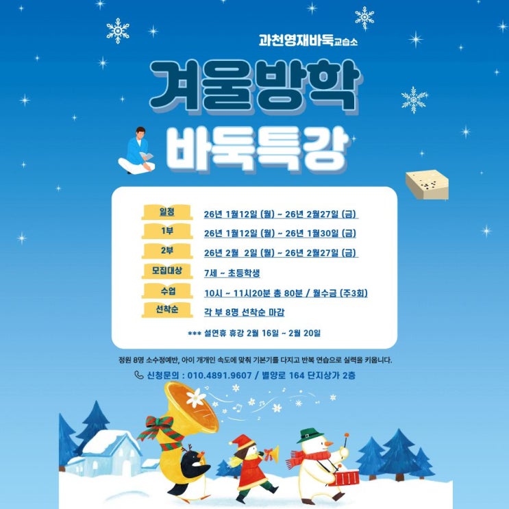 안녕하세요 과천영재바둑교습소에서 겨울방학 바둑특강을 진행합니다! 방학 동안 아이들이 재미있게 집중하며 바둑 실력을 쑥쑥 키울 수 있도록 소수 정예로 구성된 탄탄한 프로그램이에요 ❄️ 특강 일정 안내 전체 기간 26년 1월 12일(월) ~ 2월 27일(금) 1부 : 1월 12일(월) ~ 1월 30일(금) 2부 : 2월 2일(월) ~ 2월 27일(금) ✨ 모집 대상 7세 ~ 초등학생 ⏰ 수업 시간 10:00 ~ 11:20 (총 80분) 월·수·금 주 3회 진행 수강료 안내 각 부 20만원 (교재비 포함) 정원 및 신청 안내 각 부 8명 소수정예 (선착순 마감) 아이 개개인의 속도에 맞춰 꼼꼼하게 지도해요 ✨ 설 연휴 휴강 안내....... <img src="https://blogthumb.pstatic.net/MjAyNTExMjNfODgg/MDAxNzYzODg1NTc3OTI5.Wk4yRglmW3ZwE8lajFJPehZcgTG9h7CGOv77ltLBVt8g.plZ0xhb9b0-iTE8wsEHWgZCZDXcWK9pfVmcYmTgAn0cg.JPEG/%C1%A6%B8%F1%C0%BB_%C0%D4%B7%C2%C7%D8%C1%D6%BC%BC%BF%E4_%282%29.jpg?type=s3" />