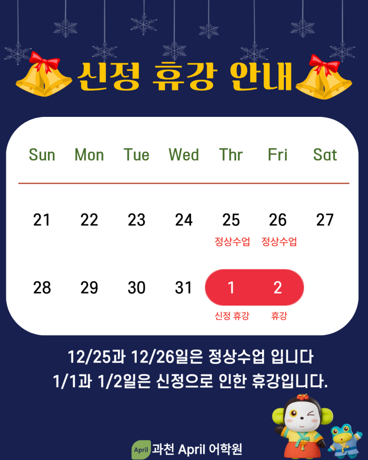 12/25(목) 크리스마스 정상 수업! 같은 날 Market Day도 함께 진행됩니다 아이들이 모아둔 April 달러 꼭 챙겨올 수 있도록 부탁드려요 ✨ 1/1(목), 1/2(금) 신정 휴강 해당 기간은 수업이 없으니 착오 없으시길 바랍니다 연말연시에도 April과 함께 알찬 시간 보내요! <img src="https://blogthumb.pstatic.net/MjAyNTEyMTBfNjYg/MDAxNzY1MzYxODE2NjE4.Prl7ZbtrMJSZctS2U9TCjtJxgz-fobn9uRIB5SnuqP8g.5RQg4upKnNqCEFvypoQ5yu7n8XYBijU_ois2vglA5OMg.PNG/%BD%C5%C1%A4%C8%DE%B0%AD.png?type=s3" />