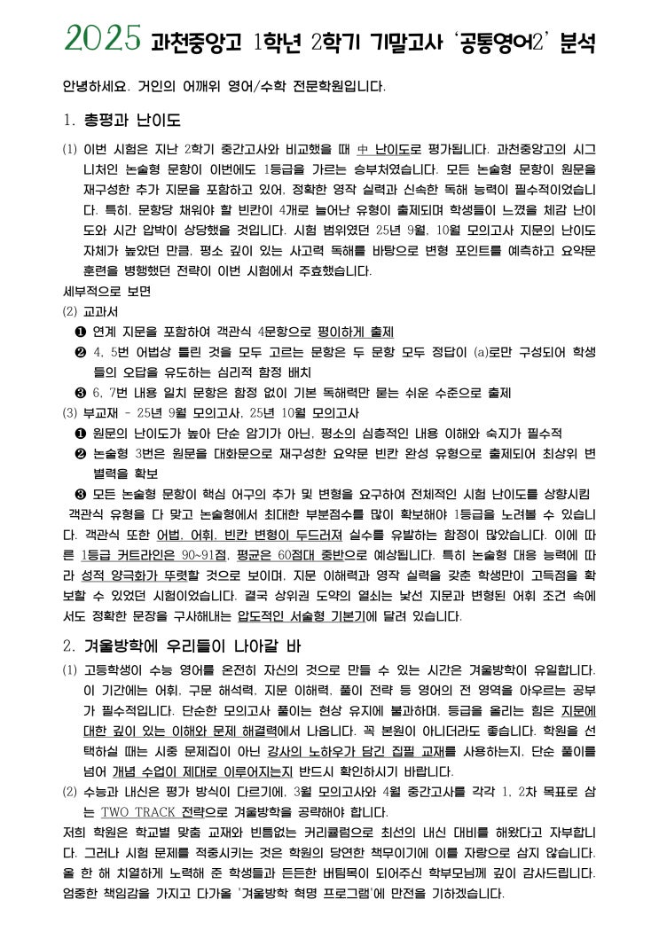 [중앙고_1학년] 2학기 기말고사 '공통영어2' 총평과 문항분석