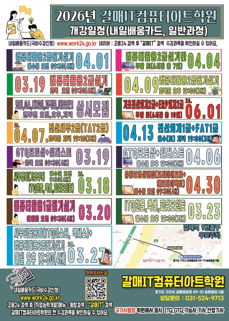 컴퓨터그래픽기능사, 전자출판기능사, 웹디자인개발 기능사 2회시험 대비반 수강생모집 예약 ( 일반과정 , 맨투맨수업 ) 26년 2회차 시험 대비반 학원에서 시험 응시 자세한문의: 031-524-9713 #갈매IT컴퓨터아트학원 #갈매동컴퓨터학원 #신내동컴퓨터학원 #중랑구컴퓨터학원 #상봉컴퓨터학원 #별내컴퓨터학원 #퇴계원컴퓨터학원 #평내컴퓨터학원 #호평컴퓨터학원 #구리컴퓨터학원 #한국산업인력공단 #갈매컴퓨터학원 #ITQ #GTQ #컴퓨터활용 #컴퓨터활용2급 #컴활2급 #컴활1급 #컴퓨터그래픽운용사 #정보처리기능사 #웹디자인기능사 #ITQ한글 #ITQ엑셀 #ITQ파워포인트 #워드프로세서 #남양주컴퓨터학원 #다산컴퓨터학원 #양주컴퓨터학원 #GTQ일러....... <img src="https://blogthumb.pstatic.net/MjAyNjAzMTZfMjAx/MDAxNzczNjIyNjk3NTAw.KYVRYQO6eN_C3WP9y2FvYqexmFKvnnp9L2dAsvVCOngg.wKXx7rpDBzshF0eFr7vsjuucAVGnyqYtqnCS9fa8WIog.JPEG/2025_design_2_%C3%E2%B7%C2%BF%EB_copy.jpg?type=s3" />