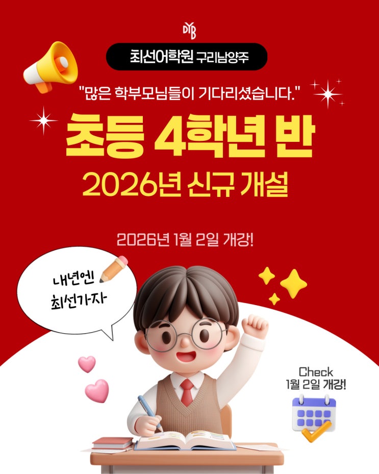 그 동안 최선어학원은 초5·초6 집중 커리큘럼으로 운영되었습니다. “초4반 언제 열리나요?” 그동안 정말 많은 학부모님들이 문의 주셨어요. 드디어! 2026년부터 초등 4학년 정규 클래스가 1월 2일 개강합니다. 최선어학원 초4반, 무엇이 다를까요? •대치동 본원 커리큘럼 •원어민 + 한국인 담임제 •초5·초6까지 이어지는 단계별 학습 레벨테스트 예약은 혼잡을 피하기 위해 예약제로 운영하고 있습니다. 예약및 교육문의 ☎ 031-556-0579 궁금하신 점은 언제든 편하게 문의 주세요. 부모님의 선택에 도움이 되겠습니다. 월 교습비 31만원 <img src="https://blogthumb.pstatic.net/MjAyNTEyMDlfMTQ2/MDAxNzY1Mjc5Mzk0NDY4.NXskeFPL71vWRS0Wca55YxHIy3VVxu6eo-PmlcgldA4g.qs0mVK6Sl4rhj1e-tjAABbRgHFE9s3PTvYIWxxFHgMQg.JPEG/001.jpg?type=s3" />