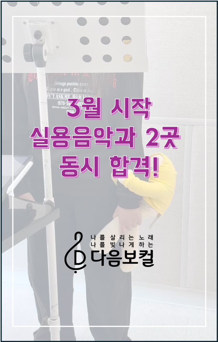 실용음악과 합격 후기 | 고3 단기입시 4년제, 2년제 실용음악과 동시 합격! | 별내보컬 안녕하세요 다음보컬입니다 3월부터 단기 준비를 시작한 고3 학생이 대진대·경민대 실용음악과 보컬 전공에 동시 합격했습니다. 실용음악과 입시에서 가장 중요한 발성·음역대·보이스톤 분석부터 맞춤 입시곡 선정, 레퍼토리 구성까지 1:1로 준비한 결과입니다 자세한 이야기 바로 시작할게요! [노래하는 모습 영상은 뒤에 살짝 넣었어요!] 오늘은 많은 수험생과 부모님들이 궁금해하시는 실용음악 입시 성공 스토리를 소개해드리려고 해요. 이번 주인공은 ✨ 대진대학교(4년제) 실용음악과 보컬 전공 ✨ 경민대학교(2년제) 실용음악과 보....... <img src="https://blogthumb.pstatic.net/MjAyNTExMjdfODMg/MDAxNzY0MjMxNjY4OTc2.WT4EY4VMYJQjzq9fuzQd67vTnDTejM7EvwaeEOA3B30g.gIDkMSUXRtWyhepTjmiT5PISnJdcWNFkRBpSCnZ0iVog.PNG/%C7%D5%B0%DD5.png?type=s3" />