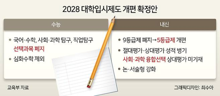 안녕하세요? 2026학년도 대입 수능시험 결과(점수)가 발표되고, 입시전형이 한창 진행중에 있습니다. 이제 올해 고1이 된 우리 친구들의 입시 (2028학년도 대입) 에 관련한 자료를 Posting 하겠습니다. 교육제도의 틀의 변화에 따라 현재 고1 친구들은 선배들과 다른 학업커리큘럼과 평가제도하에서 대학입학을 위한 큰 여정을 진행하고 있는데요, 주요 변화내용은 고교학점제의 시행, 평가등급의 변화 (5등급제), 수능시험 형태의 변화 등으로 나누어 볼 수 있겠습니다. 입시의 성공적인 결실을 얻기 위해서는 다양한 입시제도의 변화를 이해하고, 나에게 맞는 체계적인 전략을 수립하여 목표를 향한 열정적인 학습이 필요할 것이라 확신합니다....... <img src="https://blogthumb.pstatic.net/MjAyNTEyMDZfMTA0/MDAxNzY0OTk5NjA1MzEy.Ai7TZ5QiW0Q71eAdRXHSGOZIdZS2Hf3kNu7Vta3XgmIg.qFcSAUyZV0v_aWoKSt5IL4pTfF9Y_YIeYanWlXiUemcg.PNG/2028%B3%E2%B4%EB%C0%D4%BE%C81.png?type=s3" />