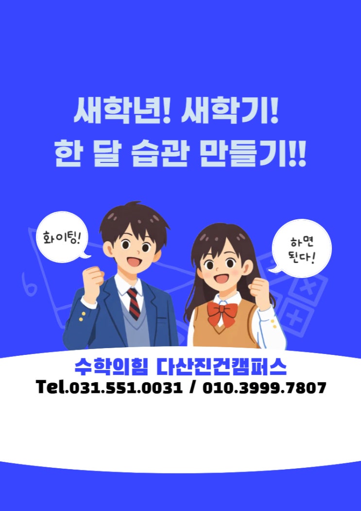 안녕하세요~ 수학의힘 다산진건캠퍼스 입니다. 길기만 한 것 같던 방학이 끝나고 새학기가 시작되었습니다. 새 교과서와 새 공책을 준비하며, 설레는 마음으로 학교 생활을 시작한 우리 아이들, 학부모님들께서도 "이번 학년에는 수학을 잘 따라갈 수 있을까?" 하는 마음이 드실 거라 생각합니다. 많은 경험을 통해 느끼는 것은 새학기 첫 한 달의 수학 공부가 1년 성적의 방향을 결정한다는 점입니다. 처음 단원을 어떻게 시작하느냐에 따라 아이들의 자신감과 성취도가 크게 달라집니다. 왜 첫 한 달이 중요할까요? 새학기 첫 단원은 대부분 이후 단원의 기초가 되는 내용으로 구성되어 있습니다. 이 시기에 개념을 정확히 이해하지....... <img src="https://blogthumb.pstatic.net/MjAyNjAyMjdfMTM1/MDAxNzcyMTgxMDEyOTA0.fkIKw61dbJyAgKmmRPz9rufVFDFM8lQAojqu7ycWkHgg.tH1B3Y8D-TEInASZV_n6xaftLLmG9H4pcXzCsgh98Mog.JPEG/%C1%A6%B8%F1%C0%BB_%C0%D4%B7%C2%C7%D8%C1%D6%BC%BC%BF%E4_-001_%2886%29.jpg?type=s3" />