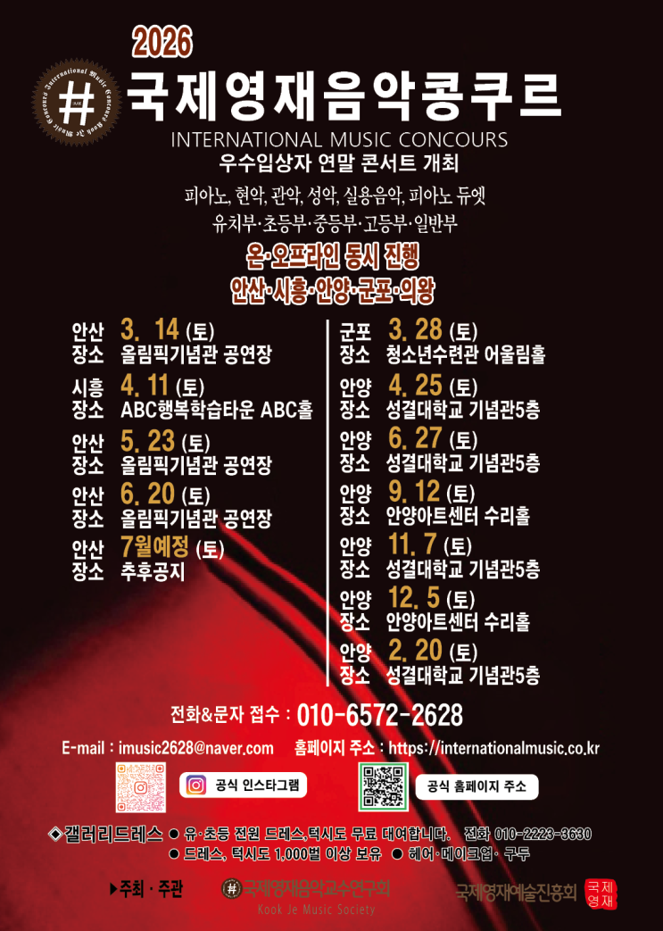 2026년 상반기 시흥, 안양, 군포, 의왕, 안양지역 진행되는 국제 영재 음악 콩쿨 일정을 안내드립니다. 참가 부문: 피아노, 현악, 관악, 성악, 실용음악, 피아노 듀엣 참가 대상: 유치부, 초등부, 중등부, 고등부, 일반부 온라인, 오프라인 동시 진행 주최, 주관 : 국제영재음악교수연구회, 국제영재예술진흥회 접수 & 문의: 010 6572 2628 안산 지역 3월 14일 (토) 안산 올림픽기념관 공연장 / 군포 지역 3월 28일 (토) 청소년수련관 어울림홀 / 시흥 지역 4월 11일 (토) ABC 행복학습타운 ABC홀 / 안양 지역 4월 25일 (토) 성결대학교 기념관 5층 / 안산 지역 5월 23일 (토) 올림픽기념관 공연장 / 안산 지역 6월 20일 (토) 올림픽기념관 공....... <img src="https://blogthumb.pstatic.net/MjAyNjAzMTFfMTMw/MDAxNzczMTU5MzE0MDc0.nHcJDPZ3yQS-TQ76m1raUfpue9AY2q72JKpmb0c_UJcg.2LqYN5plMVXke7EYKu0piKlk4UivwSSky2nOsV-K7-Qg.PNG/8af617e791d1e.png?type=s3" />