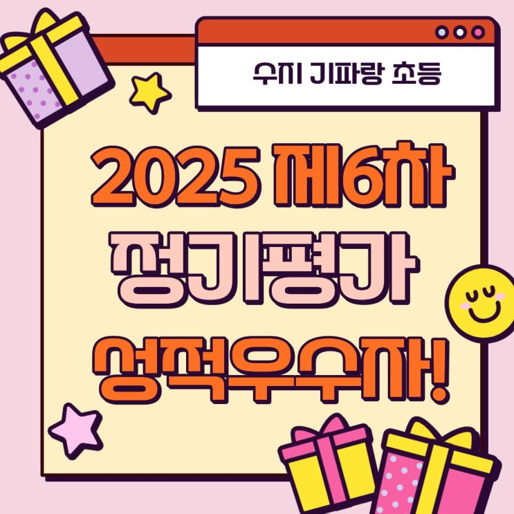 안녕하세요! 기파랑문해원 수지원입니다. 25년도 6차 정기평가 초등 정기평가 성적우수자를 알려드리겠습니다!! 위 학생들을 포함해 정기평가를 응시하느라 고생한 모든 학생들에게도 박수를 보냅니다. 모두에게 뿌듯한 2025이 되었으면 좋겠습니다. 기파랑 문해원은 다가올 2026년에도 학생들의 실력 향상을 위해 최선을 다해 노력하겠습니다. 감사합니다!! 기파랑문해원 수지원에 문의사항이 있으시다면 ↓ ↓ ↓ ↓ ↓ ♤031-265-5155(초중등) 입학테스트를 신청하고 싶으시다면 아래의 링크를 눌러주세요! (초 · 중등) ↓ ↓ ↓ ↓ ↓ https://suji.kiparang.co.kr/new_prog/entrance.aspx?menu_idx=7895 찾아오시는 길 : https://blog........ <img src="https://blogthumb.pstatic.net/MjAyNTEyMTBfODkg/MDAxNzY1MzY5NzM5MDI1.xAk1nFffj32MEg0WXgOO-p4oQCsfnqXaYoTkB4-Sqmog.CeqJYFchn-MWL8oGavI2KFoA9A4D0e7_3DYcrYUwcMcg.JPEG/1.jpg?type=s3" />