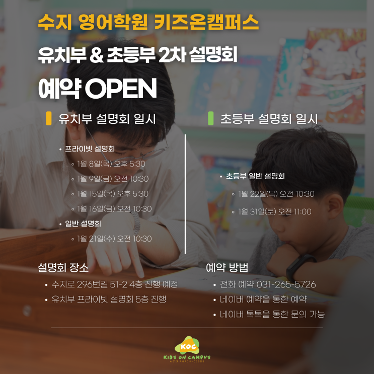A STEP AHEAD SINCE 2000 수지 영어학원 키즈온캠퍼스 어학원 안녕하세요. 키즈온캠퍼스입니다. 학부모님들의 많은 관심과 문의에 힘입어 유치부 및 초등부 2차 설명회를 추가로 진행하게 되어 안내드립니다. 자세한 일정 및 내용은 아래를 참고해 주시기 바랍니다. 유치부 프라이빗 설명회 및 일반 설명회 안내 프라이빗 설명회 1월 8일(목) 오후 5:30 1월 9일(금) 오전 10:30 1월 15일(목) 오후 5:30 1월 16일(금) 오전 10:30 일반 설명회 1월 21일(수) 오전 10:30 모든 설명회는 네이버 예약을 통한 사전 예약제 입니다. 프라이빗 설명회는 총 4회 소규모로 진행되며, 1월 21일 설명회는 프라이빗 설명회가 아닌 일반 유치부 설명회입니....... <img src="https://blogthumb.pstatic.net/MjAyNTEyMTZfMTU3/MDAxNzY1ODUyNzA4MDQy.R2txa2GsHlWOUly2pXnsQ9nLdEzOLOMQffuWtcjKy9kg.5lUVAoh2DlJgcCV0v2VXn0dY8-0OKRobfDOncH5aCLMg.PNG/2025_%C3%CA%B5%EE%BA%CE_%B0%DC%BF%EF%C7%D0%B1%E2_%BC%B3%B8%ED%C8%B8_%BE%C8%B3%BB_%281%29.png?type=s3" />