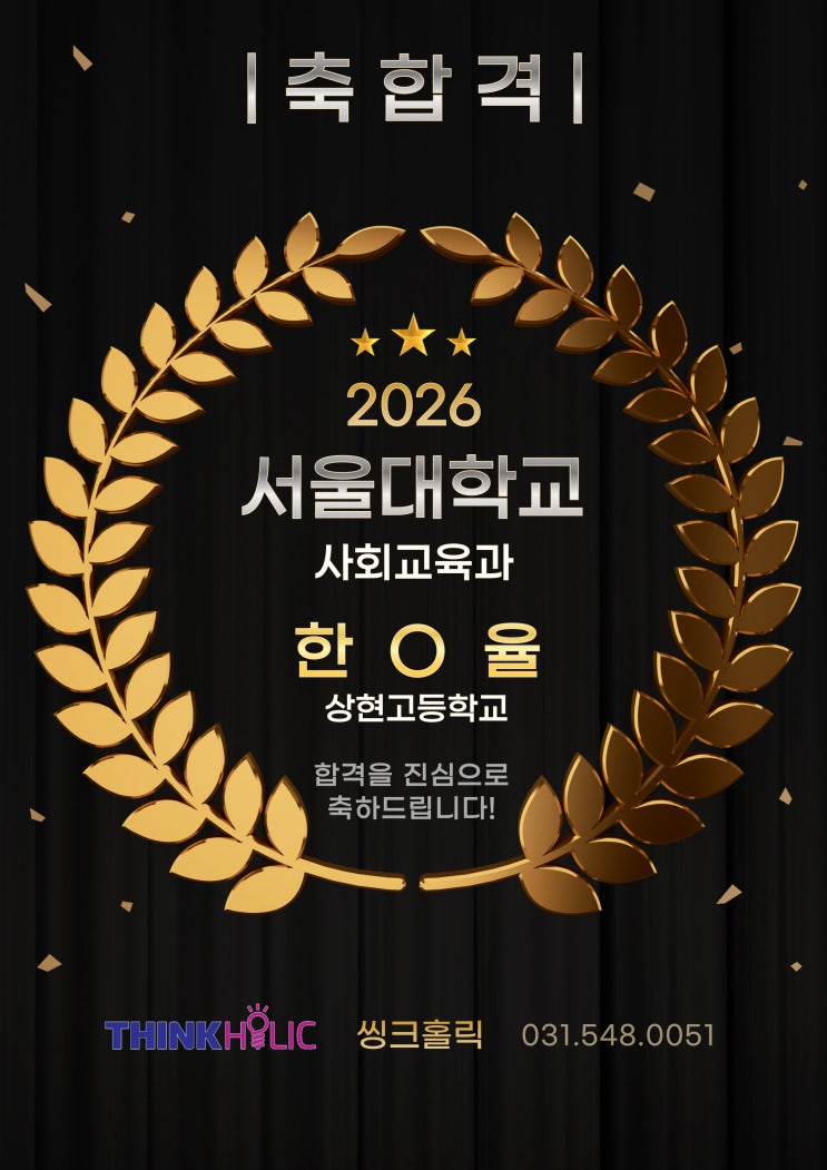 2026 서울대학교 합격생 : 한 ○ 율 (상현고3) [사회교육과] 합격을 진심으로 축하합니다! 기다리던 반가운 상현고3, 한0율 학생의 서울대 합격소식을 전해드립니다 !! 씽크홀릭에서 열정적으로 공부하던 친구의 모습을 생각하니 가슴이 벅차오릅니다. 야무지고 똑 부러지는 우리 예쁜 0율이의 즐겁고 행복한 대학 생활을 마음을 다해 응원합니다!! 더불어 더없이 기쁘고 행복한 소식을 전해주어서 정말 고마워요~♡ 친구가 가는 걸음걸음마다 행운과 축복이 가득하기를 기원합니다! 감사합니다!! <img src="https://blogthumb.pstatic.net/MjAyNTEyMTZfMjcw/MDAxNzY1ODgwNzg1MDMw.QrIril4jF6tWpgyc6iNWHf2nMqFufKgXR_-h1VMQR4Qg.dCcFssqufuhhfIY-M_MyBhI5wOdtYTFnMECTR0PRQ_4g.JPEG/%C7%D1%BC%D2%C0%B2.jpg?type=s3" />