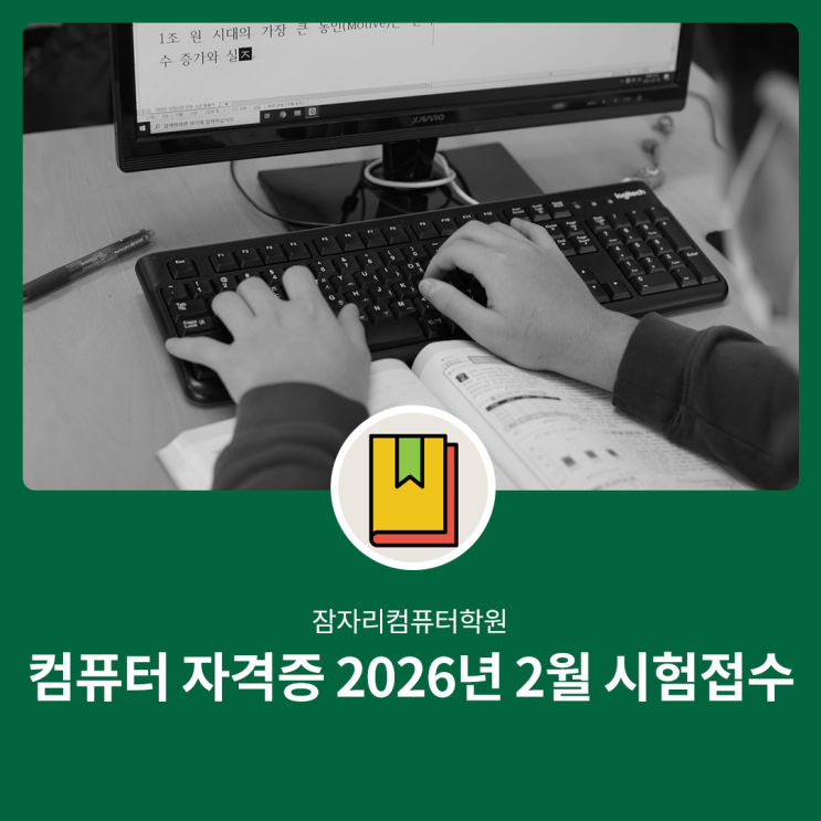 2026년 새해 컴퓨터 자격증 준비하시나요? 안녕하세요. 여러분. 경기도 광주 잠자리 컴퓨터학원 공식블로그 지기입니다. 겨울은 졸업 진학 취업을 위해 새로운 것을 준비하는 시간인데요 2026년 새해 2월 컴퓨터 자격증 한글 엑셀 파워포인트 인터넷 액세스 원서접수를 소개해 드릴게요 ▼ 잠자리 컴퓨터학원 소개 컴퓨터 자격증 원서접수 컴퓨터 자격증, 정보기술자격은 한국생산성본부에서 주관하는 컴퓨터 자격증인데요. 정보기술자격(ITQ; Information Technology Qualification)은 정보화 시대의 기업, 기관, 단체 구성원들에 대한 정보기술(활용)능력을 객관적으로 평가하는 시험입니다. 정보기술 관리 및 실무능력 수준을 지수화, 등급화....... <img src="https://blogthumb.pstatic.net/MjAyNTEyMjJfMjg3/MDAxNzY2MzcyNDE5NTAz.uHEBAWxYpF-MmjRiSD4IYXeMeM6f0oMCecf9AeJbrVgg.Ts9f_82W2FUAfU0d3Q7zt58F1Z-jYexFDyogTOaCQJcg.PNG/2025-12-22_11.png?type=s3" />