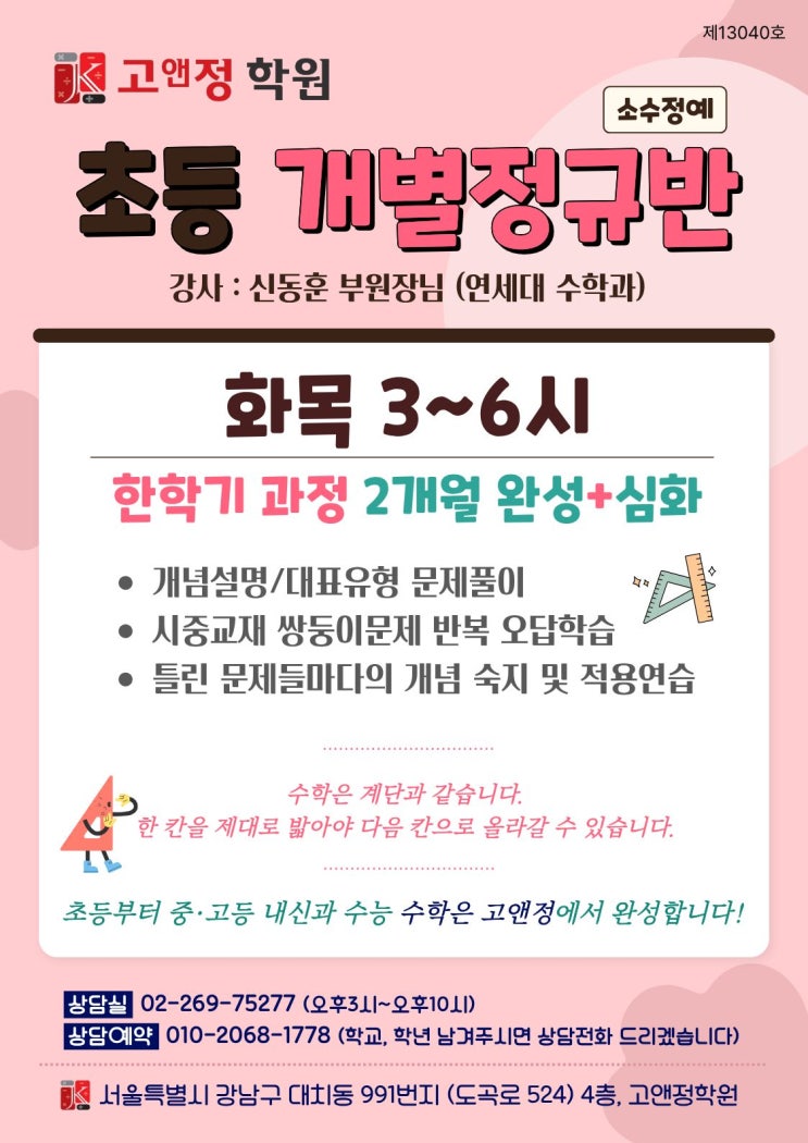 안녕하세요, 아이들의 무한한 가능성을 깨우는 고앤정 수학학원입니다. 새 학기가 시작되면서 우리 아이 수학 공부, 어떻게 시작해야 할지 고민 많으시죠? "연산은 빠른데 문장제 문제를 못 풀어요", "기초는 아는데 응용만 나오면 겁을 내요"라는학부모님들의 걱정을 해결해 드리기 위해 2026년 초등부 집중반을 개강했습니다. 한 명 한 명에게 집중하는 고품격 맞춤 수업! 높아지는 난이도에 앞서가는 전략, 초등 기초부터 고등 심화까지, 학년이 바뀌어도 흔들리지 않는 수학 자신감은 오직 밀착 관리에서 나옵니다. 초등부터 고등까지 관리가 차이를 만듭니다. 소수정예라 가능합니다. 질문을 망설이던 아이가 스스로 해....... <img src="https://blogthumb.pstatic.net/MjAyNjAzMjNfMjI5/MDAxNzc0MjY3NjEwMjU2.fOyzqVqey1S-oan--uwHGO98roJFX8Y4KWfQEpzqGiEg.vm-WW7OdMYRLzqzh9lE6dUL_Inmmec8GRv390yaDMWYg.JPEG/%C3%CA%B5%EE_%B0%B3%BA%B0%C1%A4%B1%D4%B9%DD_%281%29.jpg?type=s3" />