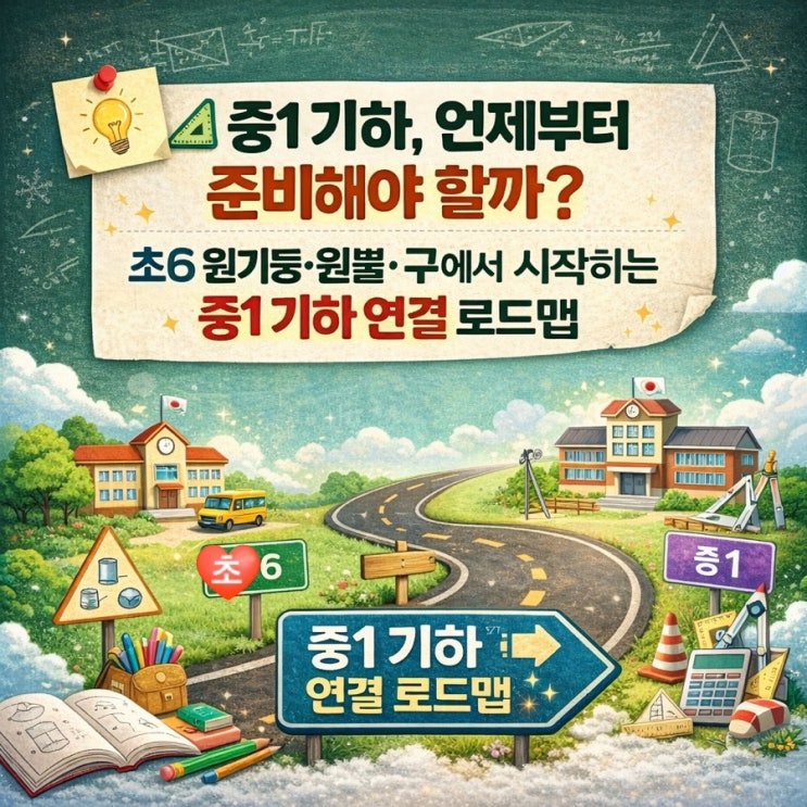 중학교 수학이 갑자기 어려워졌다고 느끼는 가장 큰 이유는 기하의 추상화입니다. 하지만 중1 기하는 새로 시작되는 내용이 아닙니다. 이미 초등 6학년 2학기 원기둥·원뿔·구 단원에서 기하의 핵심 사고는 모두 시작되었습니다. 초6 → 중1 기하를 잇는 연결 로드맵을 정리해 보겠습니다. Ⅰ. 초6 수학 6단원은 중1 기하의 출발선입니다 초6 2학기 6단원은 단순한 입체도형 단원이 아닙니다. 이 단원은 중1 기하의 ‘언어와 사고 방식’을 처음 배우는 단계입니다. 초6에서 이 연결을 놓치면, 중1에서 “갑자기 어려워졌다”는 말이 나옵니다. Ⅱ. 원기둥 → 중1 ‘면·선·점’의 개념으로 연결 ✔ 초6에서 배운 것 • 밑면 2개 (원) • 옆면....... <img src="https://blogthumb.pstatic.net/MjAyNTEyMjNfMjEg/MDAxNzY2NDQzMzg4NDc3.3Tm9Ak7VcE7d1wwH4EeunGmElnAPd-9XwcPYAlO4Qqkg.KNDHO6ilmqmEWpb7Ten6oTd1vKBBDOzlAeeeI_zltzIg.JPEG/output%A3%DF1509828776.jpg?type=s3" />