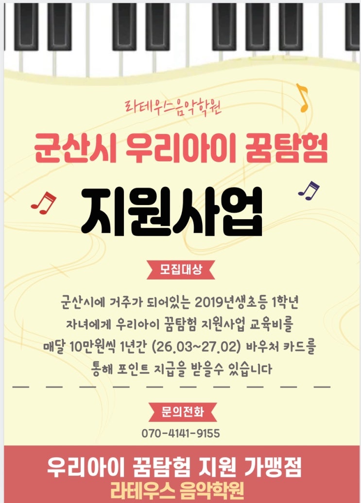 ✅군산시 우리아이 꿈탐험 지원사업 ✅2019년생 초등 1학년자녀대상 안녕하세요 라테쌤 입니다^^ 군산시에서 군산시에 주소를 둔 2019년생 초등 1학년을 대상으로 우리아이 꿈탐험 지원사업을 하고있는데요 매월 10만원씩 1년간 바우처카드로 지원되며 군산 피아노 음악학원인 라테우스 음악학원에서도 사용가능합니다. ✅라테우스 음악학원은 우리아이 꿈탐험 가맹점으로 해당 바우처 사용이 가능합니다. 음악이 있어 행복한 아이들❣️ 라테우스 음악학원 교육문의 군산 피아노학원, 군산 음악학원 [라테우스 음악학원] 010-3386-9155 모든 상담은 사전 예약제로 진행 됍니다. [이름/학교/학년/상담가능한 시간] 문자로 보내주시면 확인후....... <img src="https://blogthumb.pstatic.net/MjAyNjAzMDRfMTEx/MDAxNzcyNTc1MjQ4NjMz.TXdese52uswepGtVeYN5pt635PpRTD8f2IPHoFFnhHAg.ZmZch8gLktrXIPrzcFCBwD3XKwvijPLvD9F4kdUslZog.JPEG/IMG%A3%DF8723.jpg?type=s3" />
