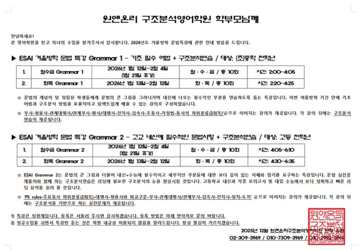 안녕하세요! 2026년 ESAI 겨울방학 문법특강 개강이 얼마 남지 않았습니다. 매년 겨울과 여름 한 세트로 진행되는 <전문적인 문법특강> 입니다. 짧은 기간에 중요 문법을 원리에 맞추어 정리할 수 있는 매우 좋은 특강입니다. 함께 참여하세요^^ <img src="https://blogthumb.pstatic.net/MjAyNTEyMTZfMTgx/MDAxNzY1ODE5MTE0ODI4.OWjTEMARPCiw-ajuU2HZN-9zbK_GgegG5vdTSWjOQ38g.dv7Y-rkQpSBkgM-LXfO4sZpLmObW4K9eG4qgYCDtx-og.JPEG/IMG%A3%DF5511.JPG?type=s3" />