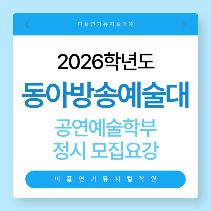 안녕하세요~! 피플연기뮤지컬학원입니다 오늘은 2026학년도 정시 동아방송예술대학교 공연예술학부 모집요강을 가져왔습니다~! 입시를 준비하는 분들은 꼼꼼히 살피시어 지원하시길 바랍니다. ✅전형일정 ✔️원서접수 -2025.12.29. ~ 2026.01.14. 23:59 ✔️실기고사 -2026.01.19. ~ 01.19. ✔️합격자 발표 -2026.02.02. 16:00 ✅모집인원 및 반영비율 ✔️모집인원 연극과 -일반전형 21명 -전문대 이상 졸업자 10명 -기회균형선발 4명 뮤지컬과 -일반전형 10명 -전문대 이상 졸업자 5명 -기회균형선발 2명 방송영화연기과 -일반전형 남자 8명 -일반전형 여자 7명 -전문대 이상 졸업자 5명 -기회균형선발 3명 kpop과 -일반....... <img src="https://blogthumb.pstatic.net/MjAyNTEyMTZfMjU0/MDAxNzY1ODU1ODE0ODI3.2rBkjdakAgR2Whqm7oW-7bVYhzjm8AZGXT8aFUKkqEUg._QI8tvQI9abgrabe0UNcgS8X0VHKFwas8R15bl5DSxEg.JPEG/%C1%A6%B8%F1%C0%BB_%C0%D4%B7%C2%C7%D8%C1%D6%BC%BC%BF%E4_-001.jpg?type=s3" />