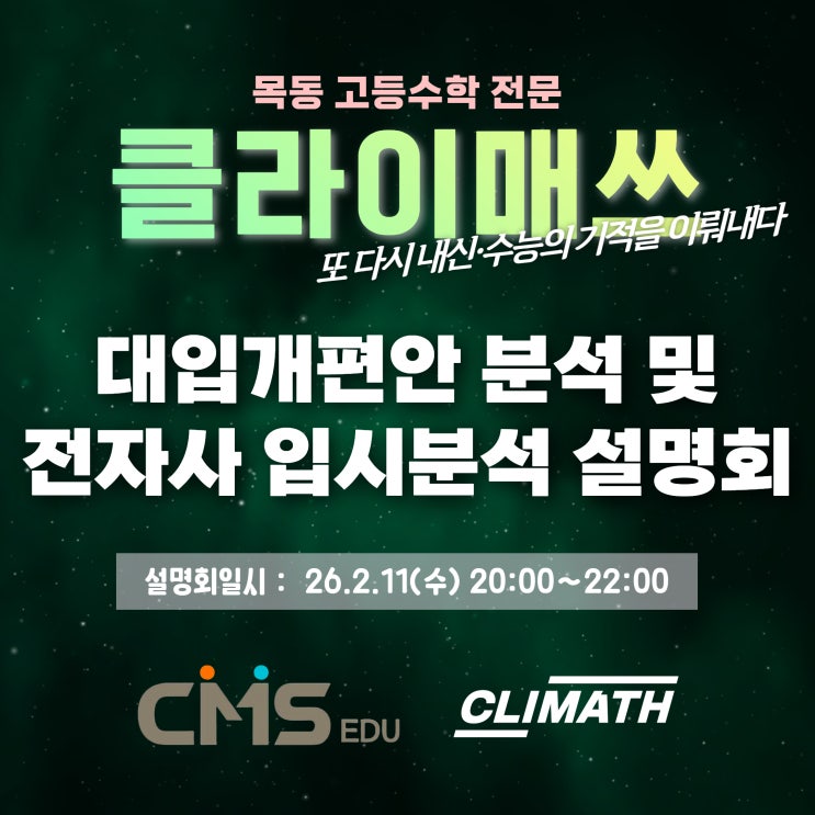 입시는 바뀌었고, 전략은 더 정교해져야 합니다. 고교학점제와 내신 5등급제, 그리고 2028 대입 개편안까지. 이제는 학교 선택과 전형 선택을 동시에 설계해야 하는 시대입니다. CMS, 그리고 클라이매쓰와 함께 대입 흐름을 정확히 읽고, 우리 아이에게 맞는 최적의 입시 전략을 확인해 보시기 바랍니다. 2월 11일 수요일 20시 CMS입시센터&클라이매쓰 목동관 대입개편안 분석 및 전자사 입시분석 설명회!!! ↓↓↓ 아래 링크에서 신청하세요 ↓↓↓ 일시 : 2026년 2월 11일(수) 20:00 ~ 22:00 장소 : 목동 트윈빌 4층 최강독서실 (CMS 입시센터 & 클라이매쓰 목동관) ※ 트윈빌 지하주차장 주차 가능 설명회 1부 (20:00 ~ 21:00) 고....... <img src="https://blogthumb.pstatic.net/MjAyNjAyMDNfMjU1/MDAxNzcwMTA3MzMyODQ2.tiqjvTACHXz7KEDPRSfRSrG-iNi0iF1o3LFAemntUSkg.-JFCf9VyXEwL_lJS3BNXQreo3AFMbunZ7IFkkHe6Eiwg.JPEG/%C5%AC%B6%F3%C0%CC%B8%C5%BE%B2_26%B3%E2_2%BF%F9_%BC%B3%B8%ED%C8%B8_%BD%E6%B3%D7%C0%CF.jpg?type=s3" />