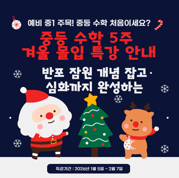 예비 중1 주목! 중등 수학 처음이세요? _반포 잠원 개념 잡고 심화까지 완성하는 중등 수학 겨울 몰입 특강 안내