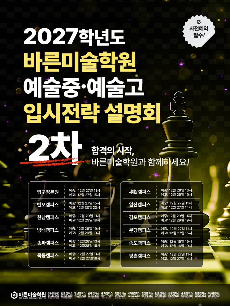 안녕하세요~~~ 예중예고입시전문미술학원 바른미술학원 반포캠퍼스의 반포바른이 입니다 ~ : ) 아쉽게 설명회 참석을 못하셨던 분들을 위해서 12월27일에 다시 한번 설명회를 합니다. 예중 12월 27일 15시 예고 12월 30일 20시 예약필수!! 2027학년도 예중 · 예고 입시전략에 대해 상세히 알려드리도록 하겠습니다. 초5 또는 중2는 마지막 입시 기회를 놓치지 마세요~ 반포바른미술학원과 함께 준비해보세요!! 나의 꿈이 현실이 되는 공간, 바른미술학원!!" 꿈을 향한 열정에 성의로 답하겠습니다! 학생의 꿈과 마주하는 순간, 바른미술학원의 열정은 멈추지 않습니다. 단 하나를 위한 열정과 끈기 바른미술학원이 함께 하겠습니다. 1:1 상....... <img src="https://blogthumb.pstatic.net/MjAyNTEyMTZfMTAz/MDAxNzY1ODYzNzI5MTUy.KoPtu4j0L7CJr3MrsJc--TNGRQ6EyzB-q0Va2nAD8f8g.nKs2QgQQrKvNb6R9aYzPhdpDVvrK8T939Z31Vi2NaKgg.JPEG/i_ae1a82c301fa.jpg?type=s3" />
